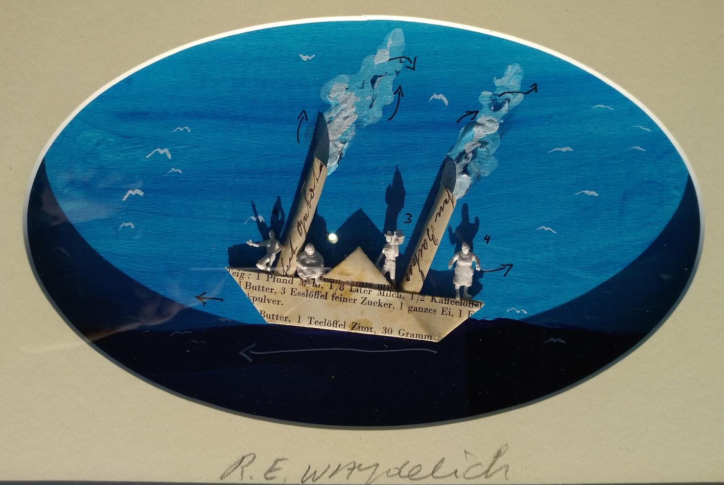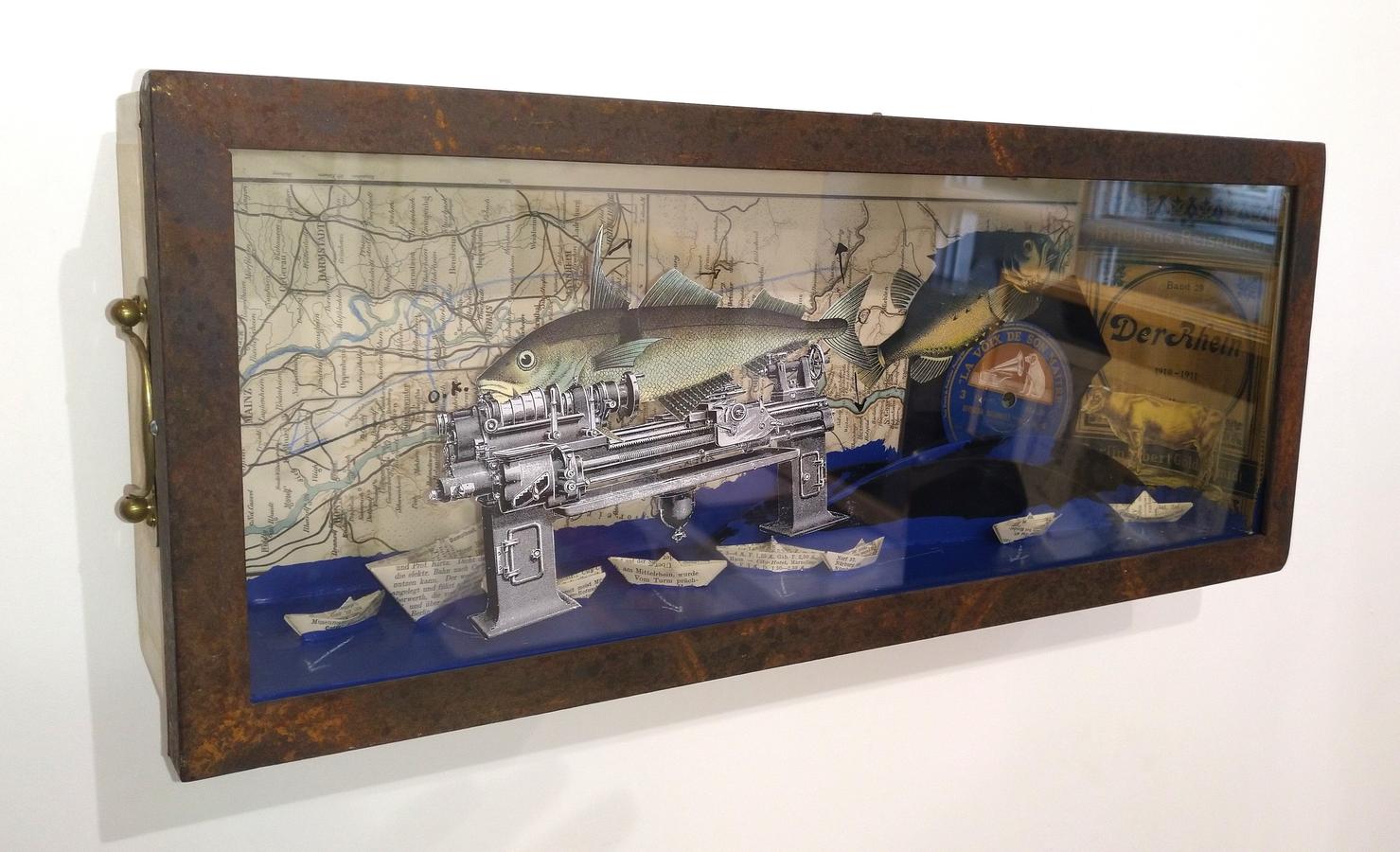 Mischtechnik ( Holz, Papier (Landkarte), Schellack-Schallplatten, Glas, Eisen, Oel, Tusche,, Siegellack)