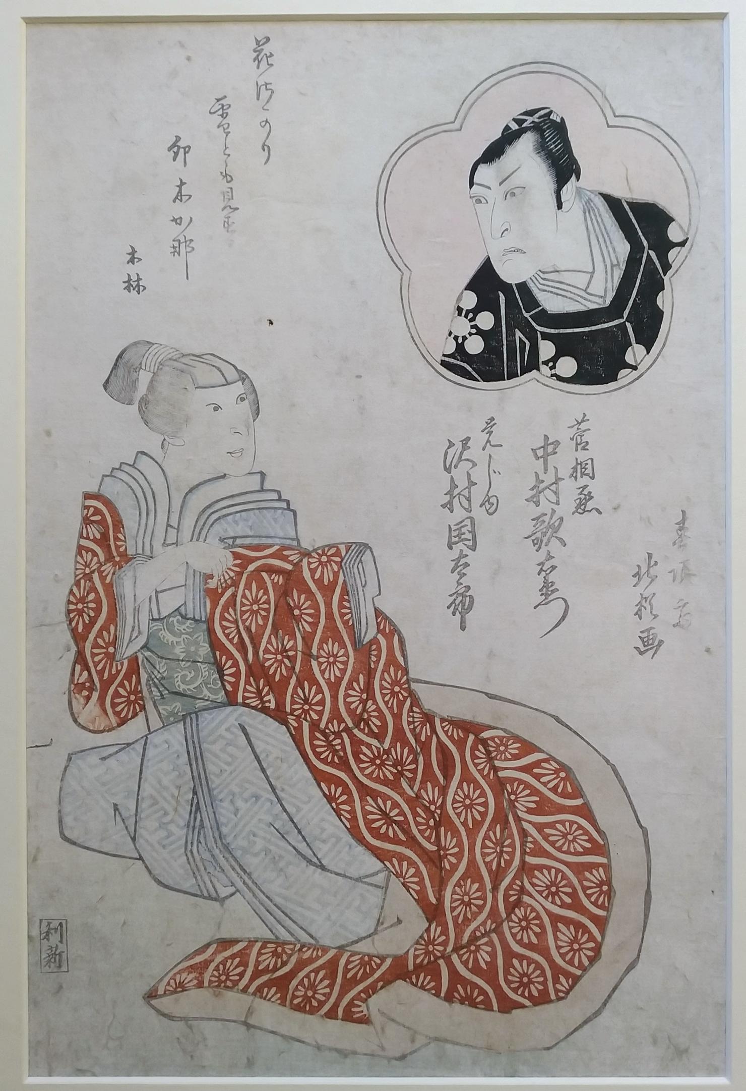 Schauspieler Sawamura Kintaro als Frau Kakuyu und in blütenförmigem Feld: Schauspieler Nakamura Utaemon III als Sugawara Aisuke. Lobgedicht.