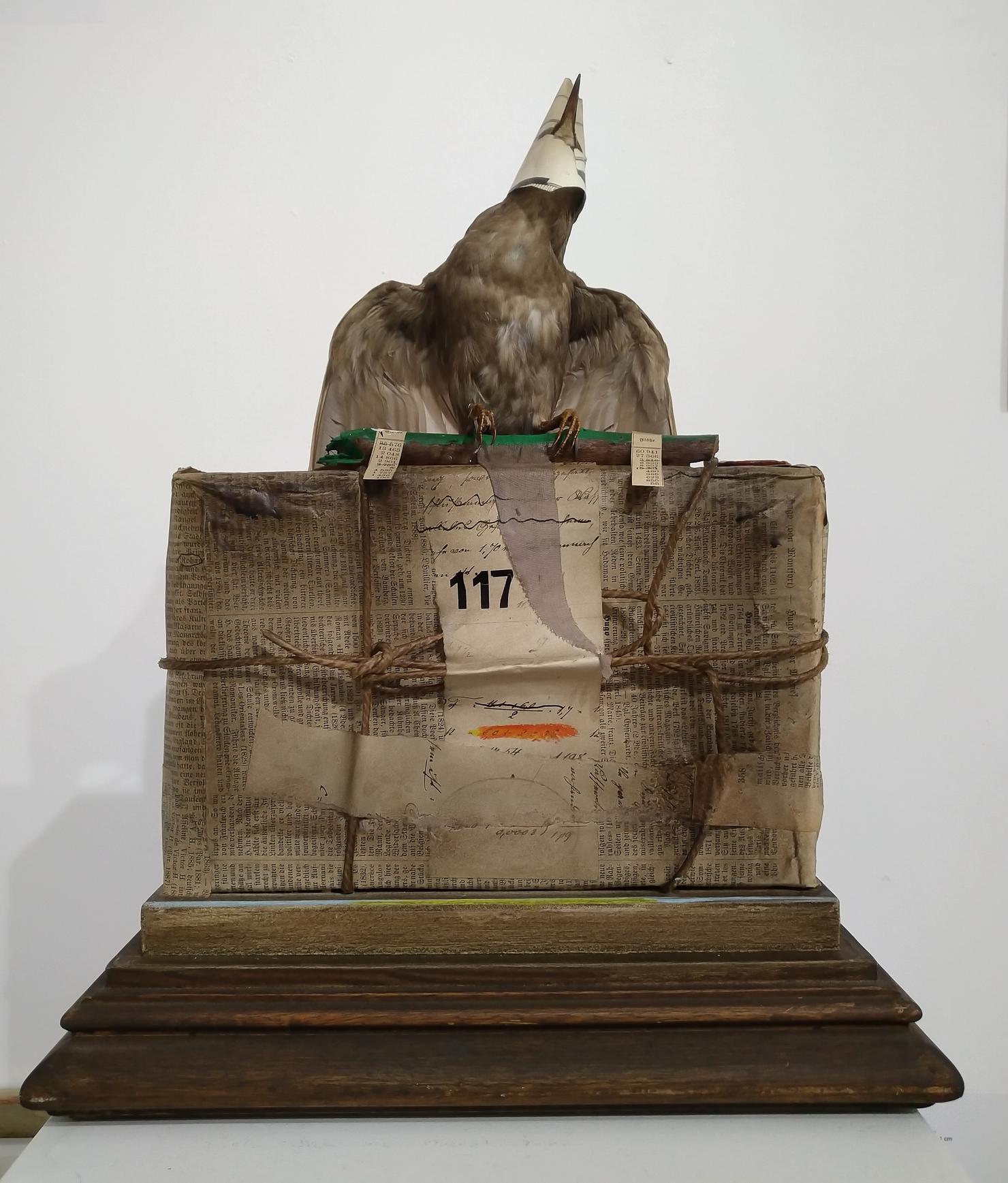 Mischtechnik (Ausgestopfter Vogel, Holz, Papier, Glas, Oel, Tusche, Schnur, Messer, Siegellack)