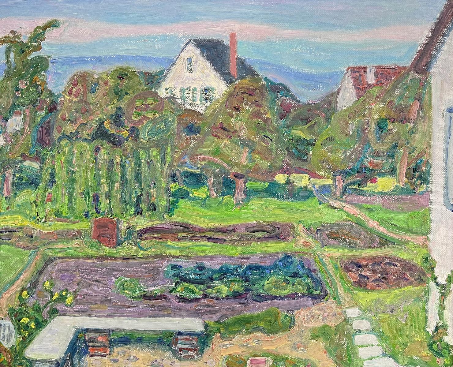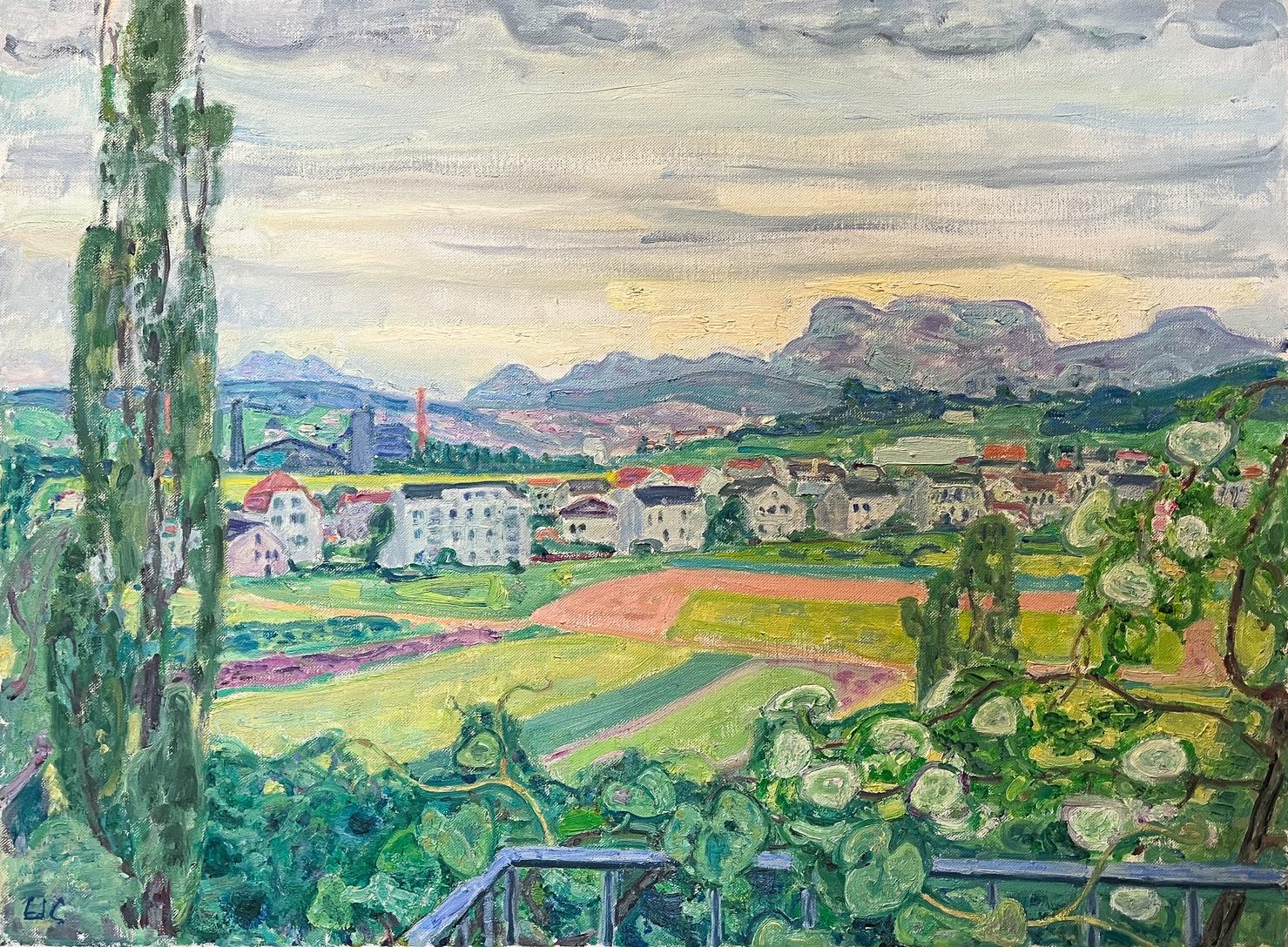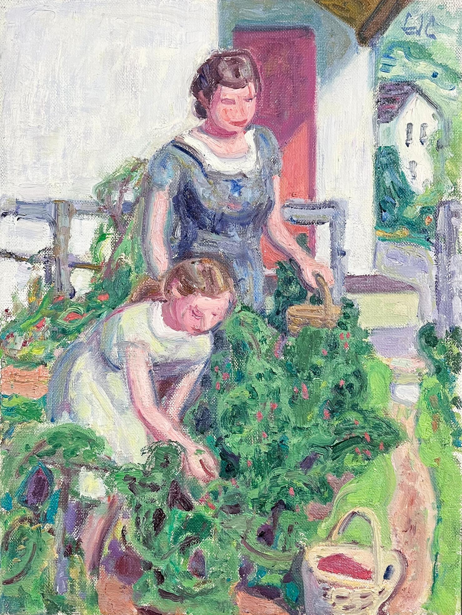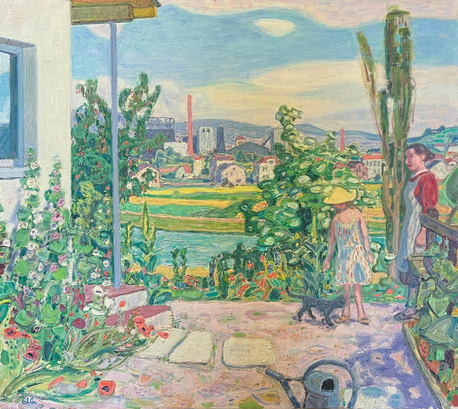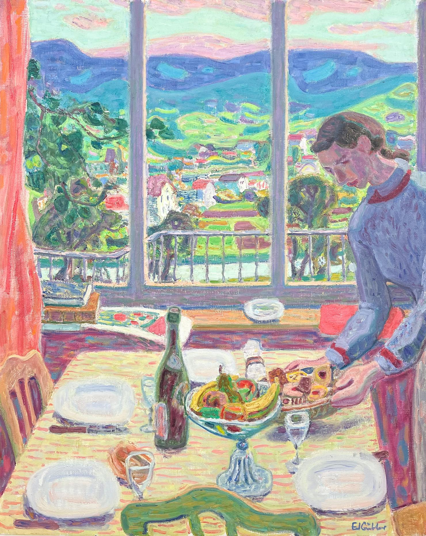 Im Oktober 1925 heiratete er Marie Bilek und lebte mit ihr ab 1928 in einer Atelierwohnung im Dachstock des neu errichteten Erweiterungsbaus des Volkshauses. Marie und die beiden Töchter Maria, genannt Maja (1930–2022), und Verena (*1943) standen dem Künstler häufig Modell, obwohl er auf die Ausgestaltung individueller Gesichtszüge meist verzichtete. 1937 liess sich sein jüngerer Bruder, der Maler Max Gubler (1898–1973), in Unterengstringen ein Atelierhaus mit Ausblick über die umliegenden Gärten, Felder und Gemeinden errichten. Das Atelier, die Terrasse und die Umgebung hält Eduard Gubler in den hier gezeigten Landschaftsbildern fest. Auch wenn es angesichts der frischen Farben, des Lichts und der Lebendigkeit der Bilder kaum denkbar ist: Der Künstler malte seine Bilder nicht im Freien, sondern schuf sie im Atelier. Die Kompositionen zeichnete er mit rosa Farbe auf die Leinwand und finalisierte die Werke im Rahmen.