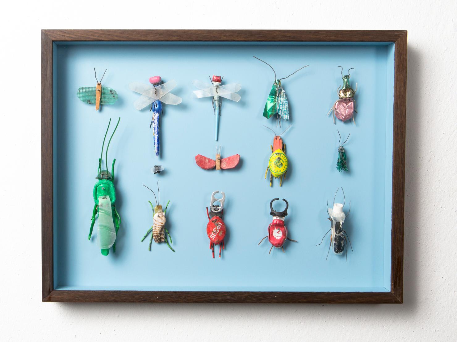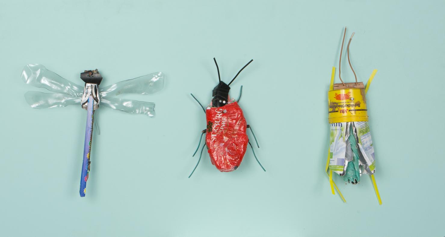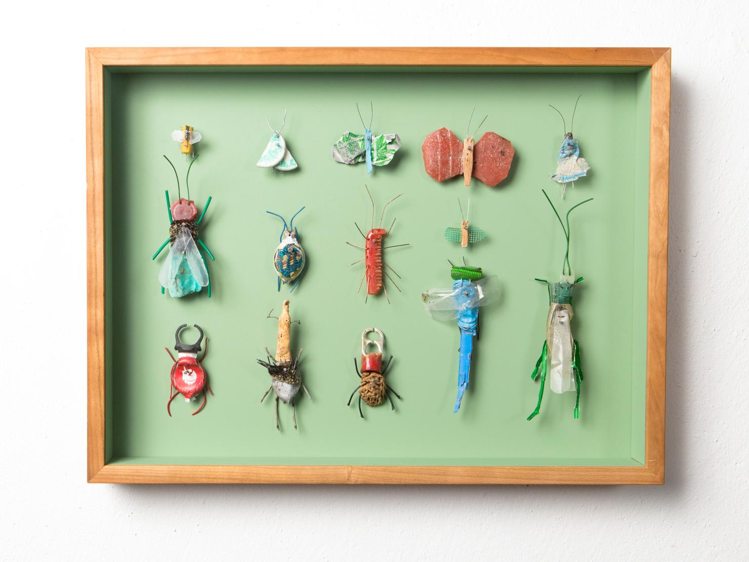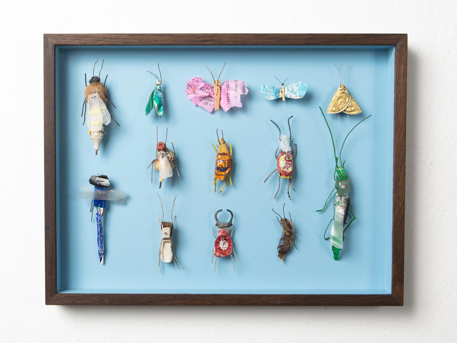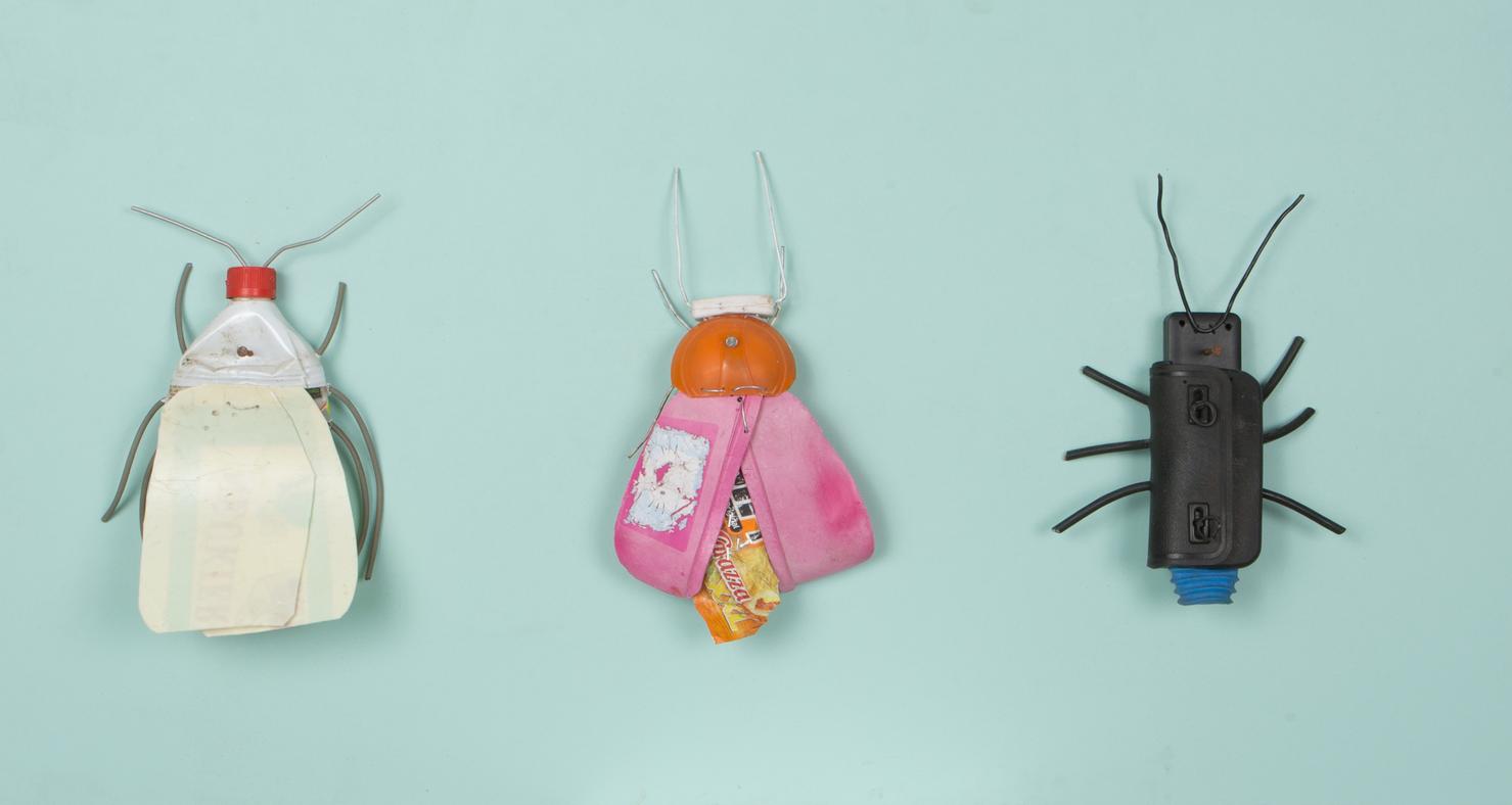 Seine Vogelfiguren sind auf Augenhöhe und überlebensgroß, alle haben Charakter und bestehen auch mal aus alten Laternen. In seinen Insektenkästen wimmelt es bunt und vielfältig – dabei ist alles … Müll!
