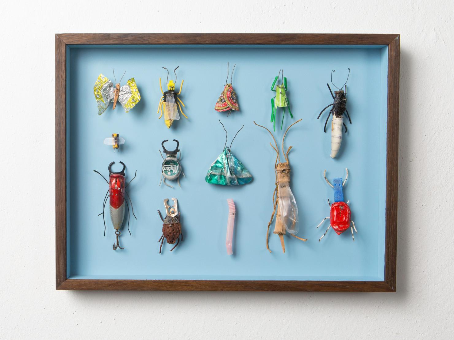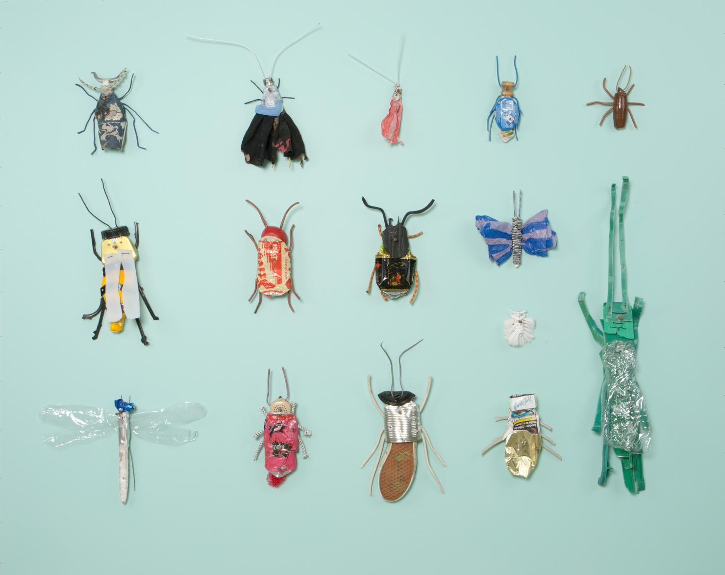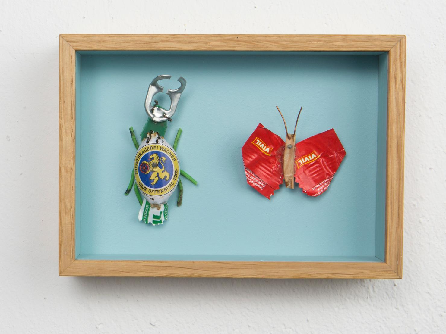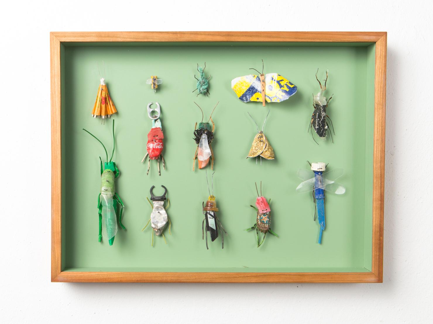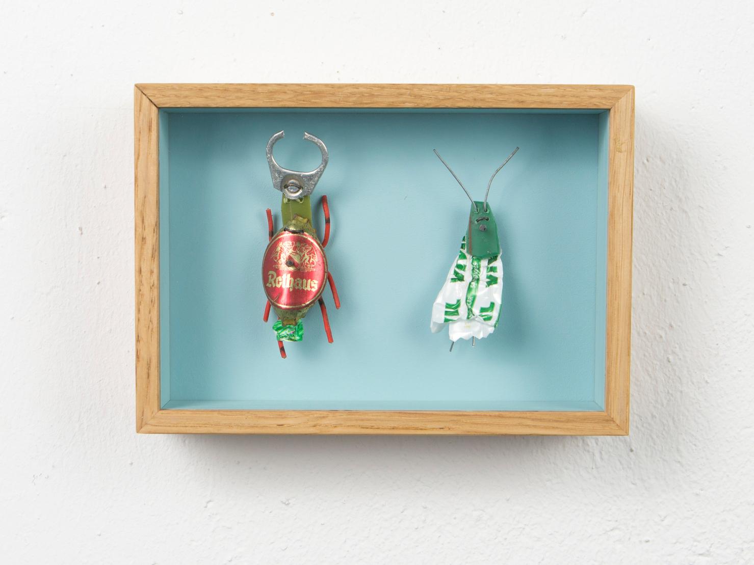 Seine Vogelfiguren sind auf Augenhöhe und überlebensgroß, alle haben Charakter und bestehen auch mal aus alten Laternen. In seinen Insektenkästen wimmelt es bunt und vielfältig – dabei ist alles … Müll!
