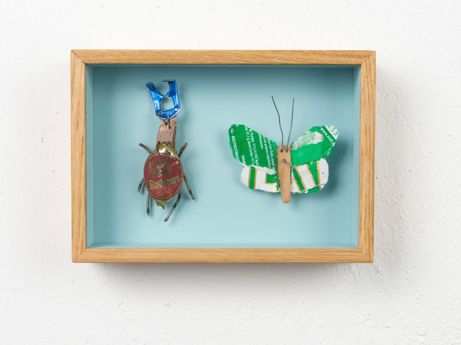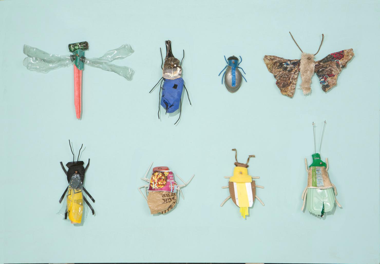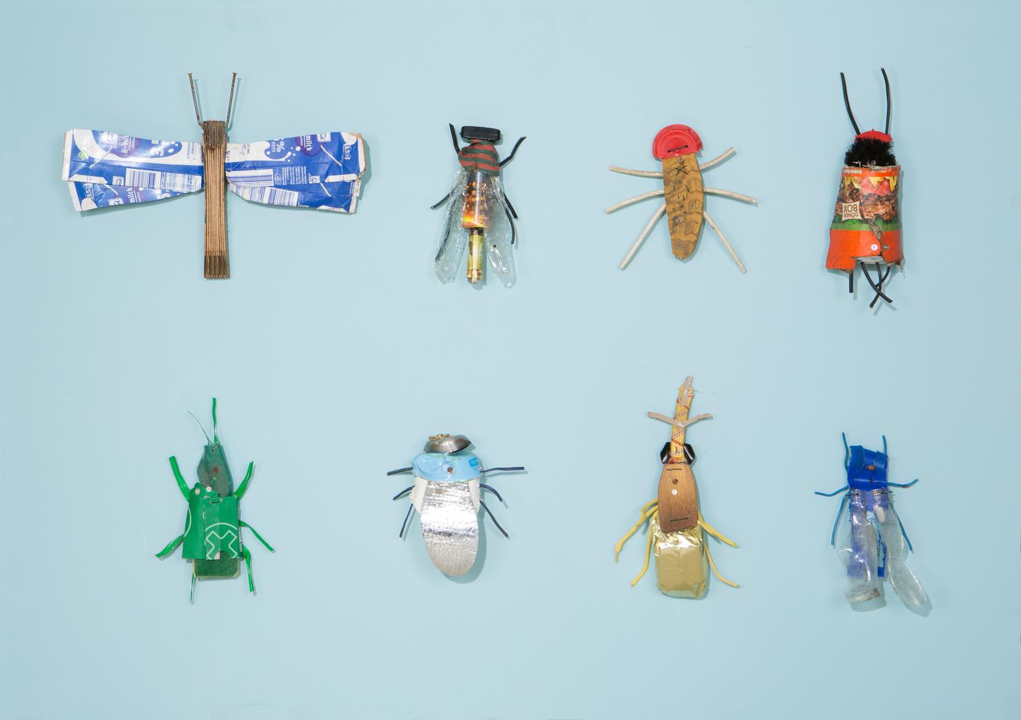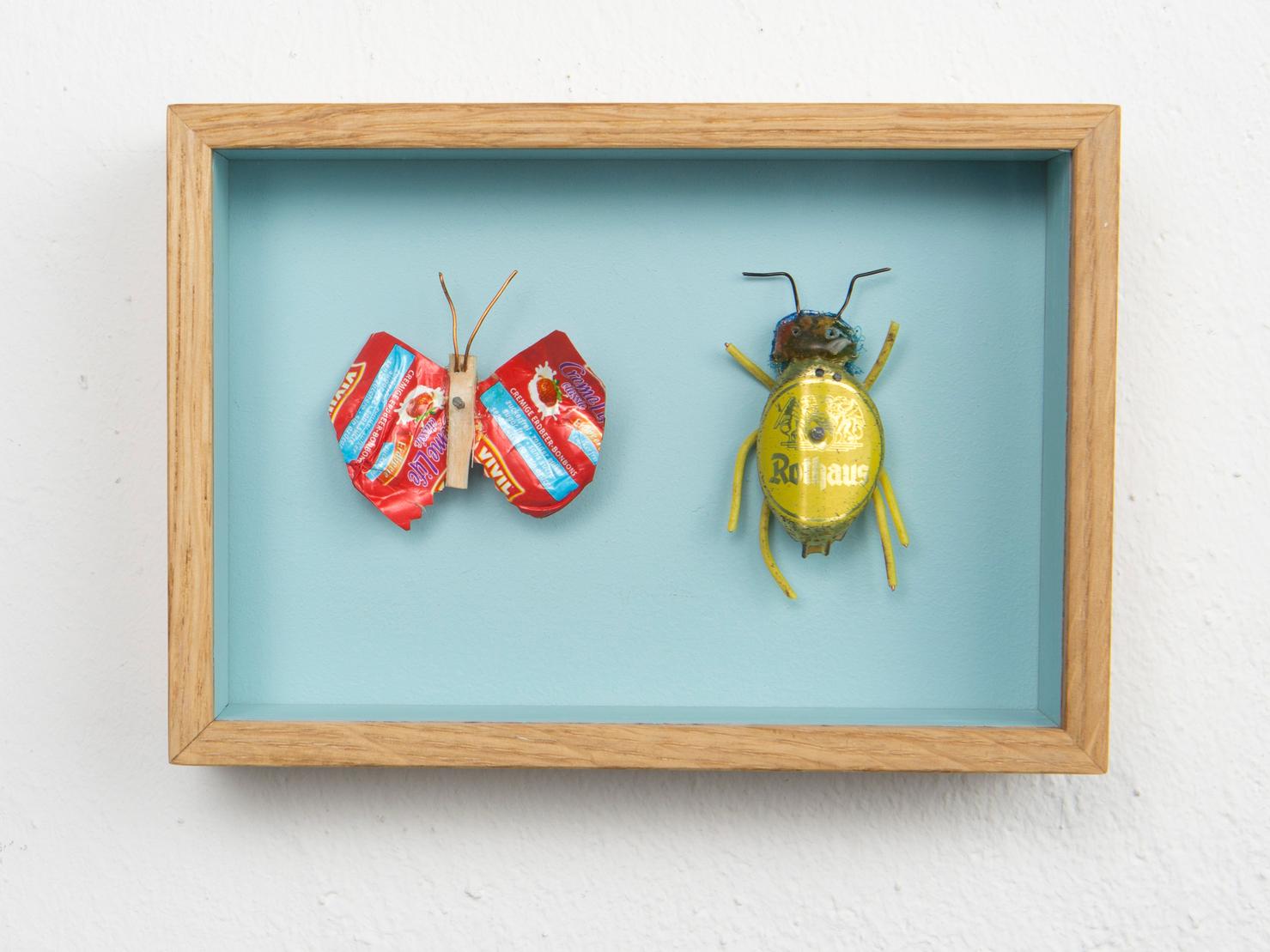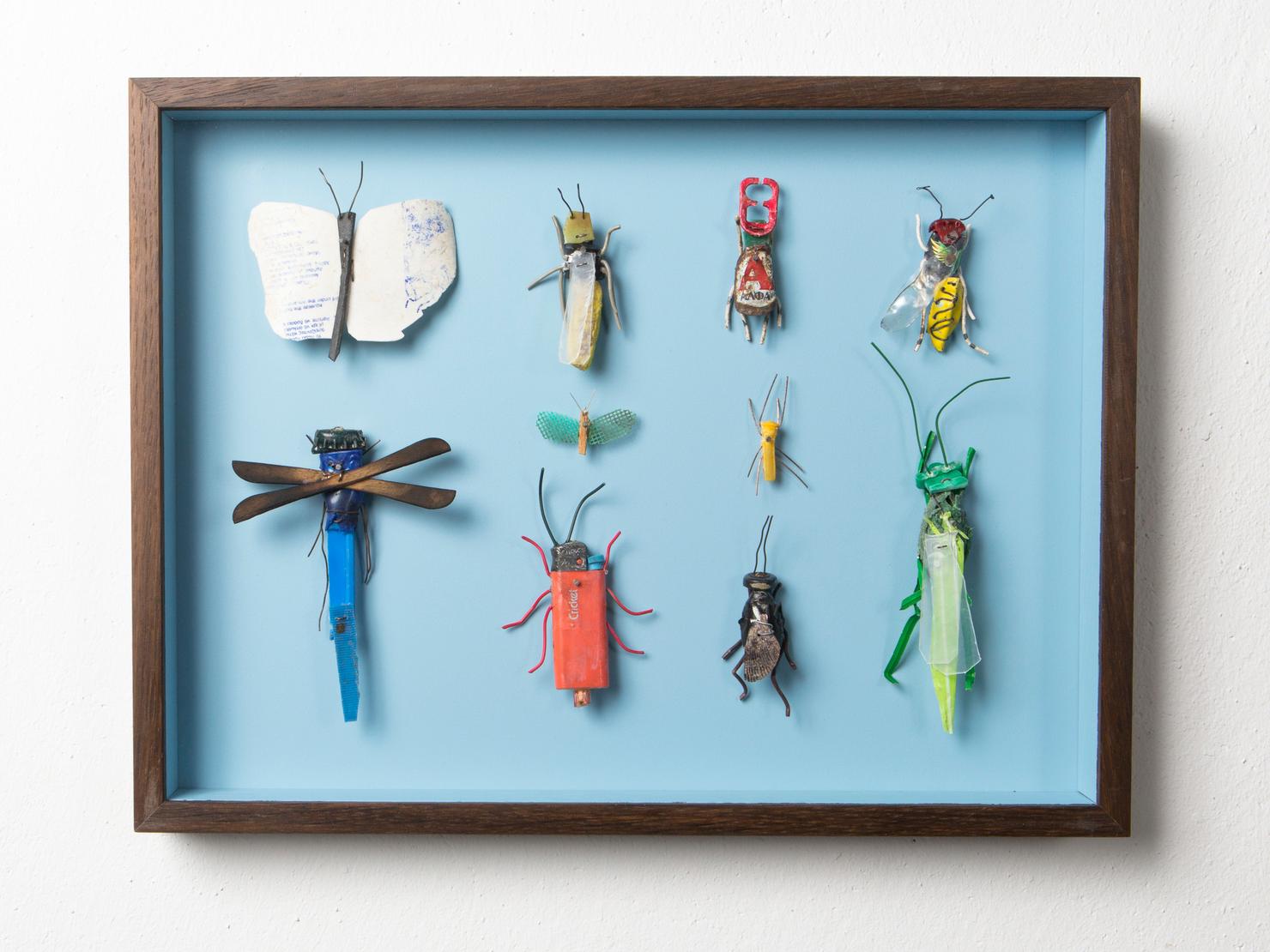 Seine Vogelfiguren sind auf Augenhöhe und überlebensgroß, alle haben Charakter und bestehen auch mal aus alten Laternen. In seinen Insektenkästen wimmelt es bunt und vielfältig – dabei ist alles … Müll!