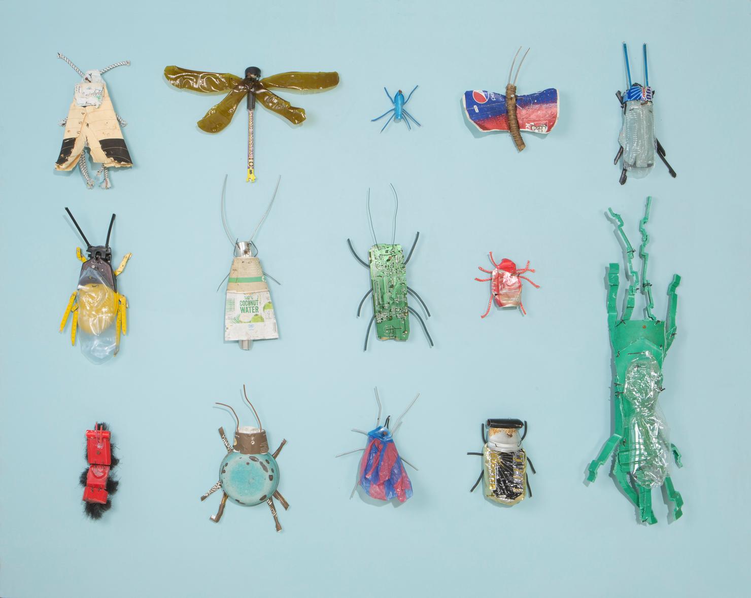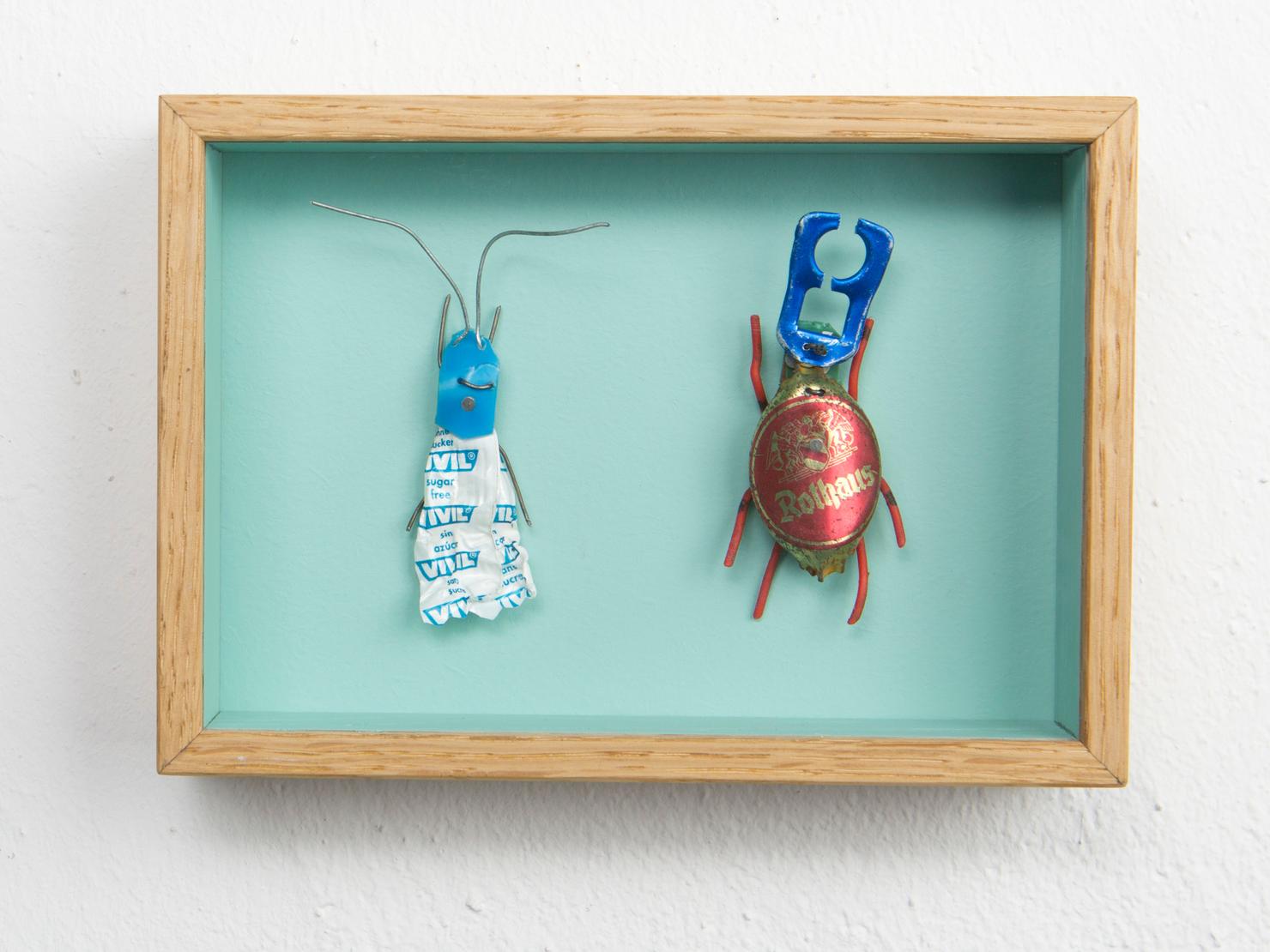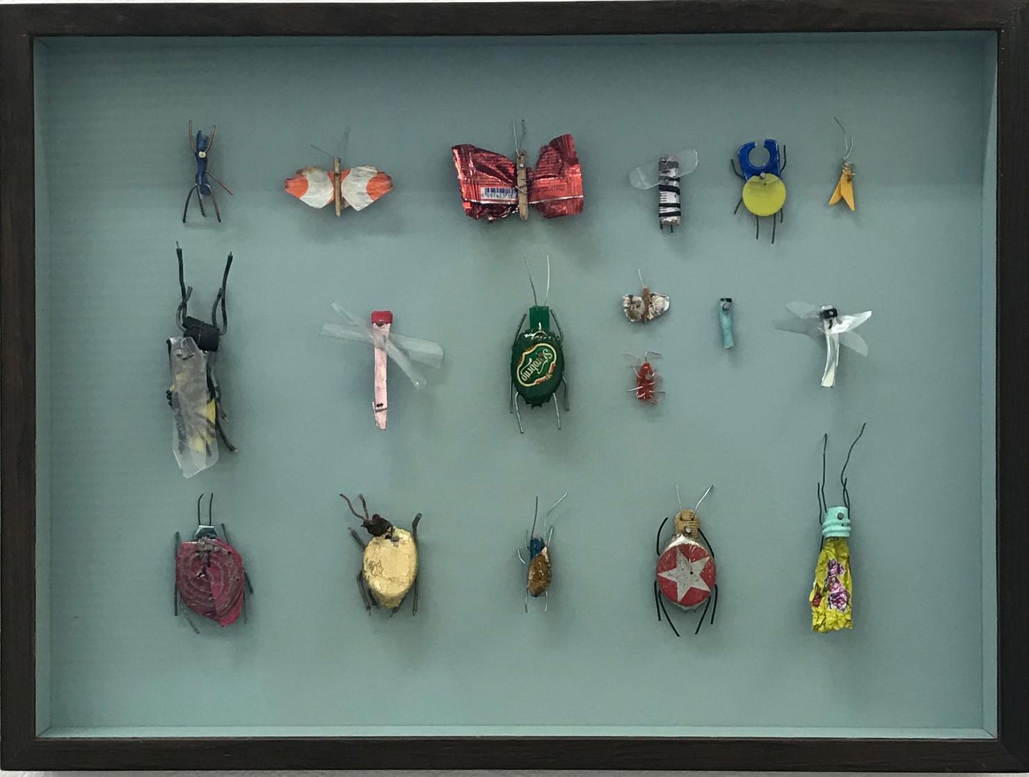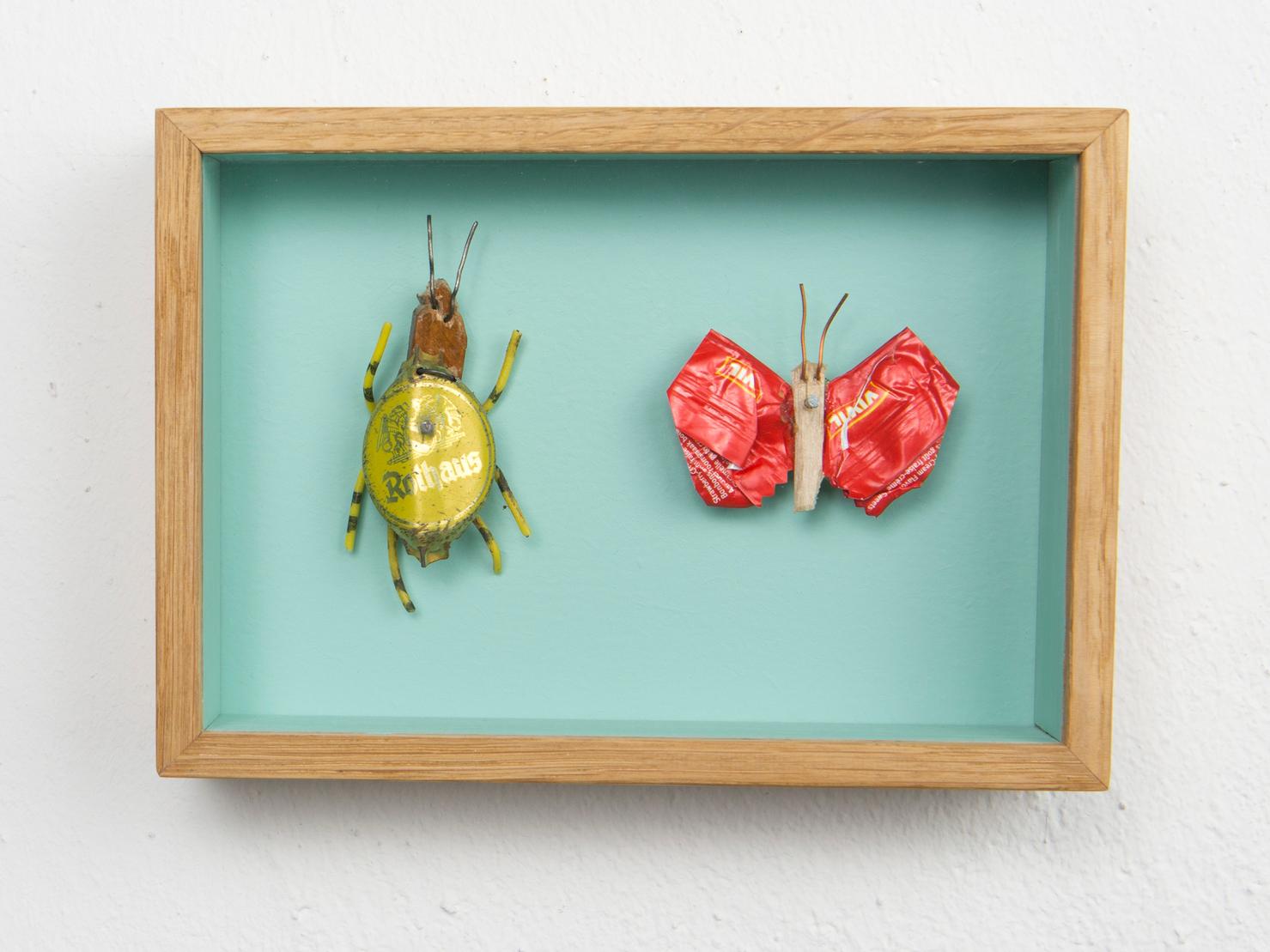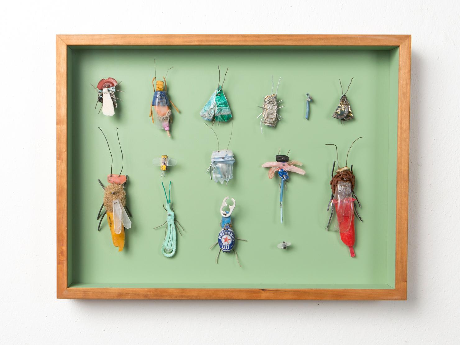 Seine Vogelfiguren sind auf Augenhöhe und überlebensgroß, alle haben Charakter und bestehen auch mal aus alten Laternen. In seinen Insektenkästen wimmelt es bunt und vielfältig – dabei ist alles … Müll!