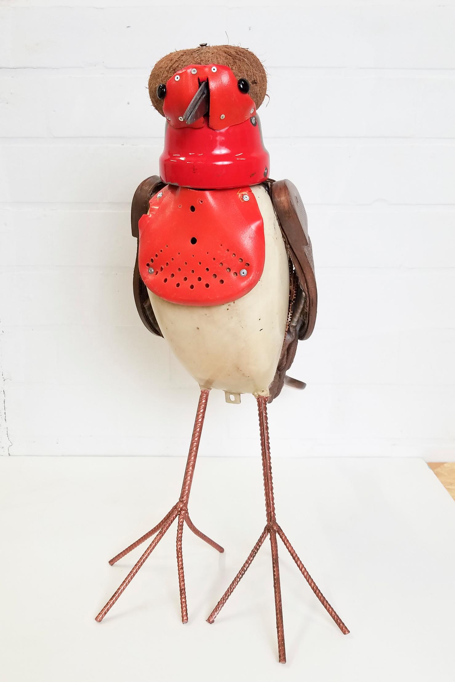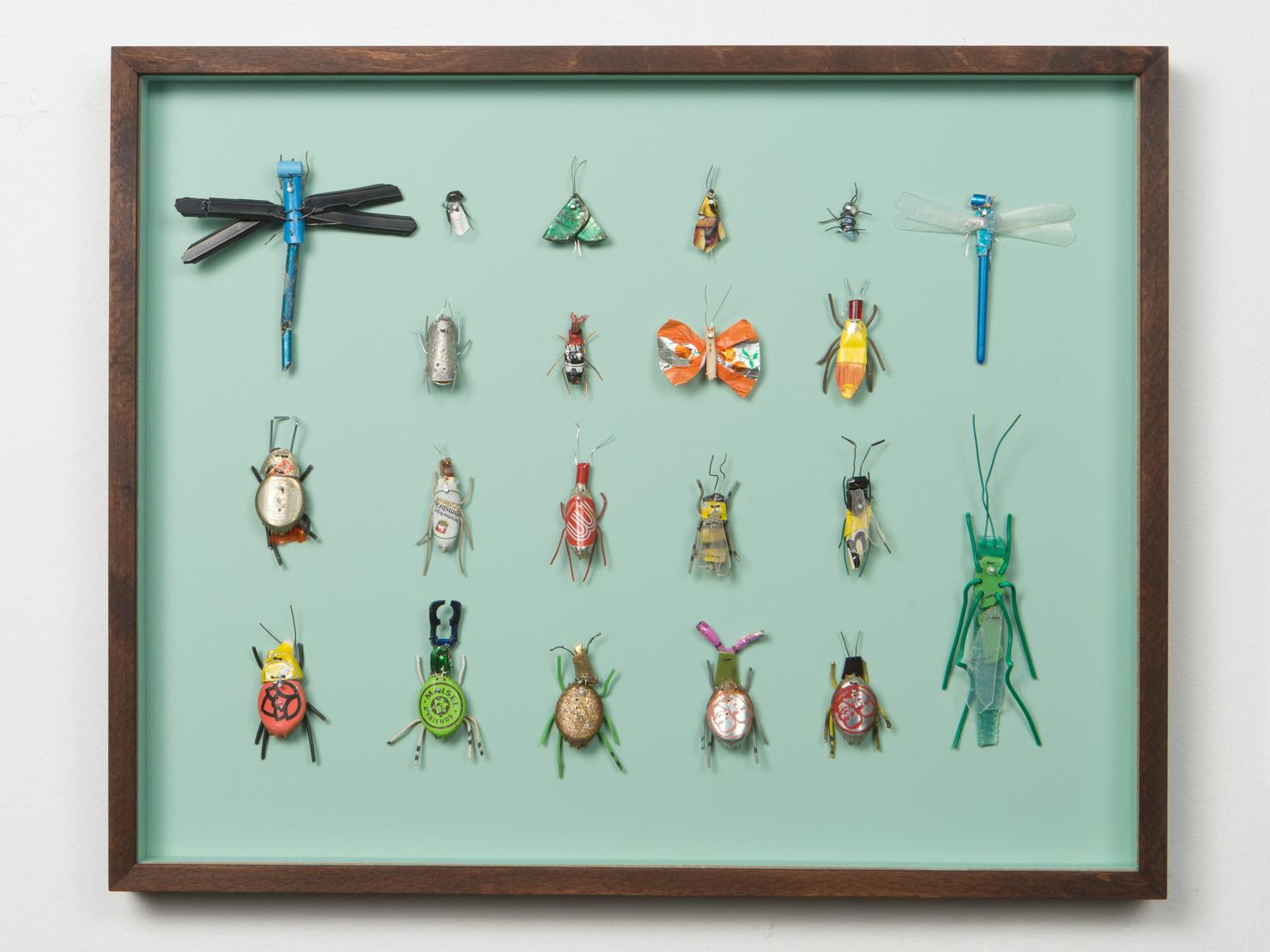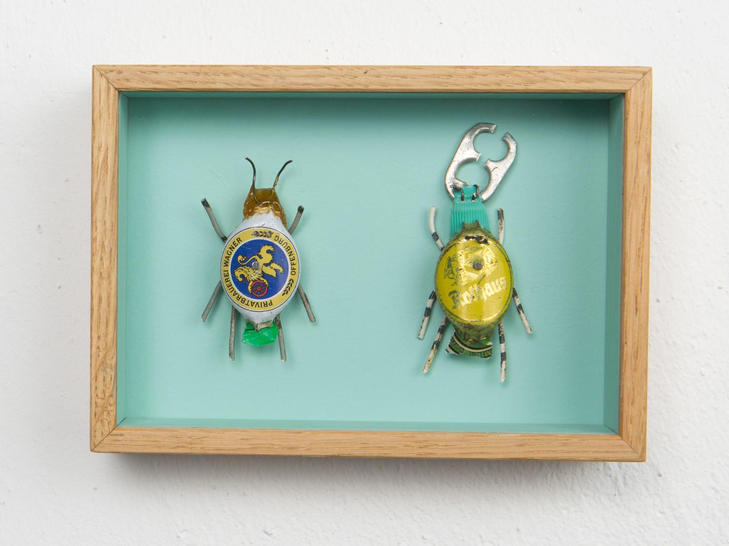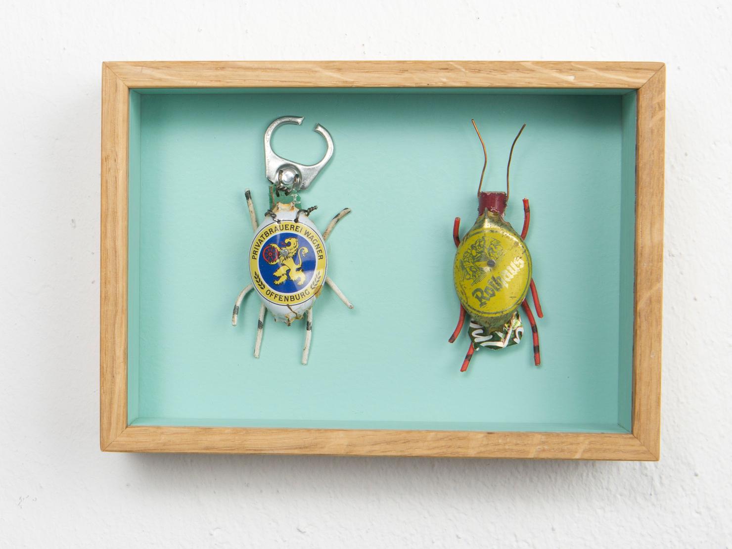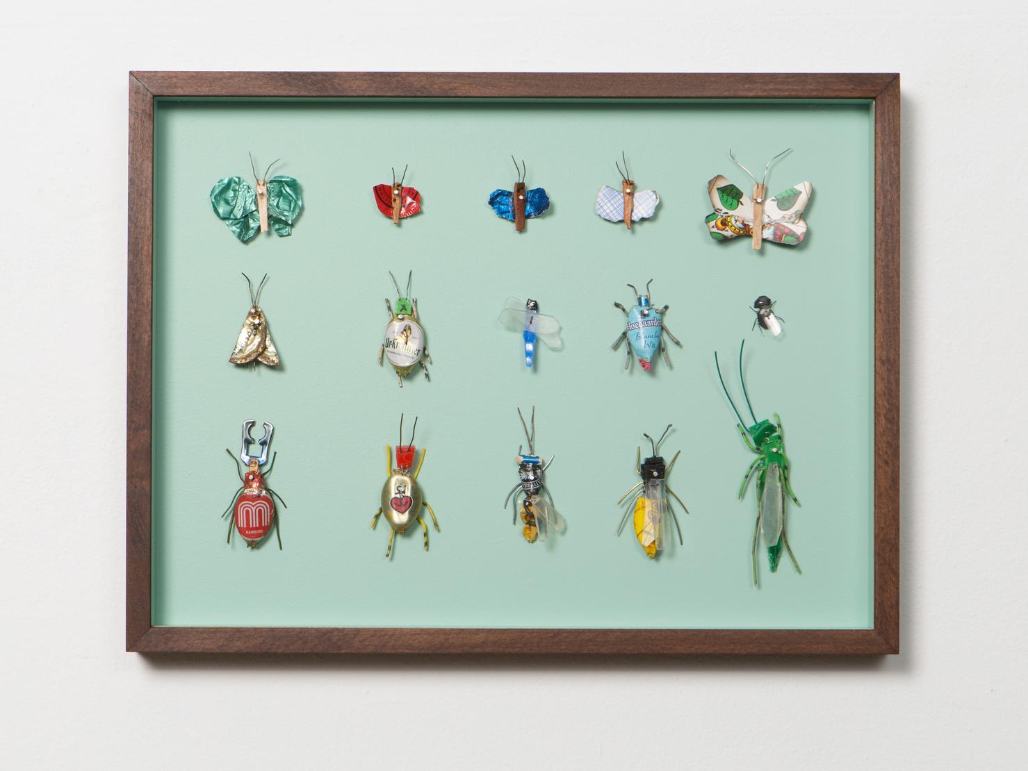 Seine Vogelfiguren sind auf Augenhöhe und überlebensgroß, alle haben Charakter und bestehen auch mal aus alten Laternen. In seinen Insektenkästen wimmelt es bunt und vielfältig – dabei ist alles … Müll!