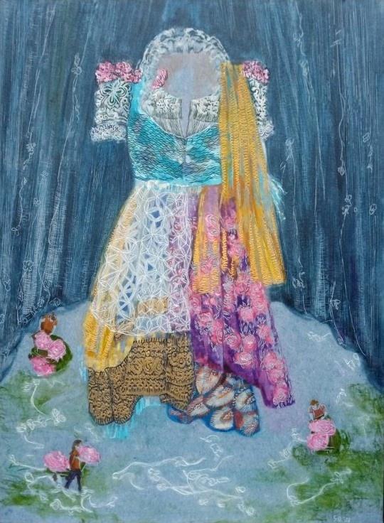 Papier auf Papier, Nähgarn, Museumsglas