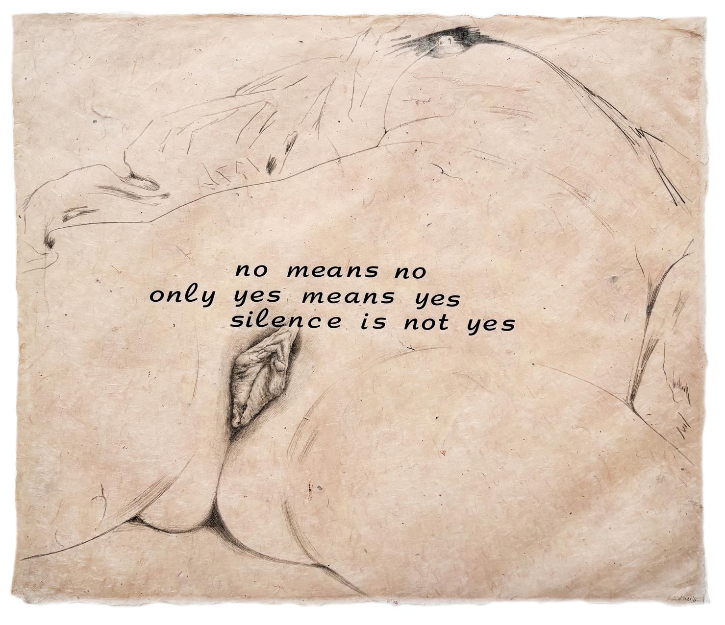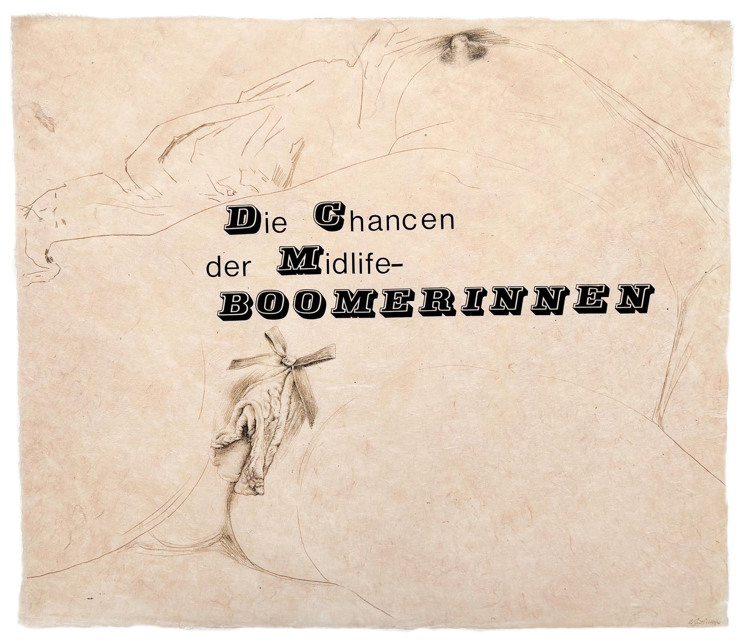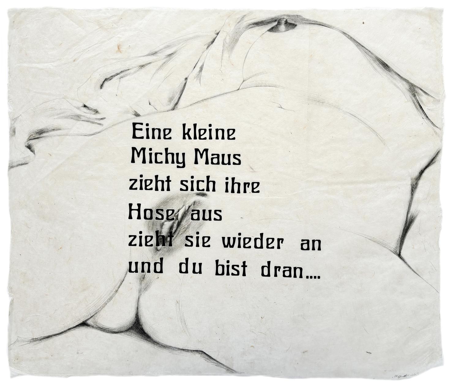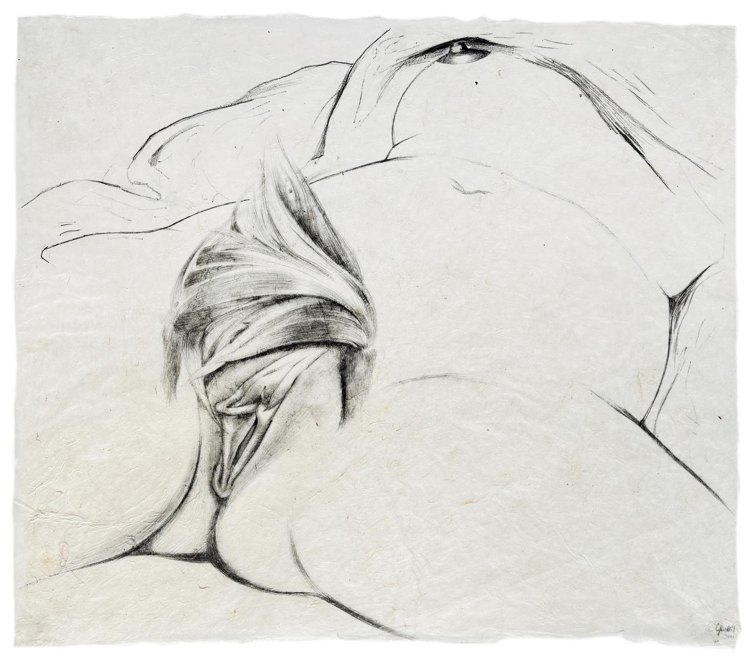 Grundlage der dadahaften Gesten dieser Künstlerin bildet eine Bleistiftskizze auf Papier, die unter Beibehaltung der Originalmaße von 46 x 55 cm den „Ursprung der Welt“ von Gustave Courbet wiedergibt. Aber dort, wo der französische Maler den weiblichen Schoß ganz nature, um nicht zu sagen etwas zerzaust abbildet, gestaltet sie das Schamhaar mit solch hingebungsvoller Fantasie, dass dieses als seltsame Perücke erscheint, zum Schmuck des weiblichen Geschlechts, eines Elements, das stets klar und deutlich in seiner Fleischlichkeit immer gut sichtbar ist. Exzessiv in seiner Art, sich den Blicken darzubieten.