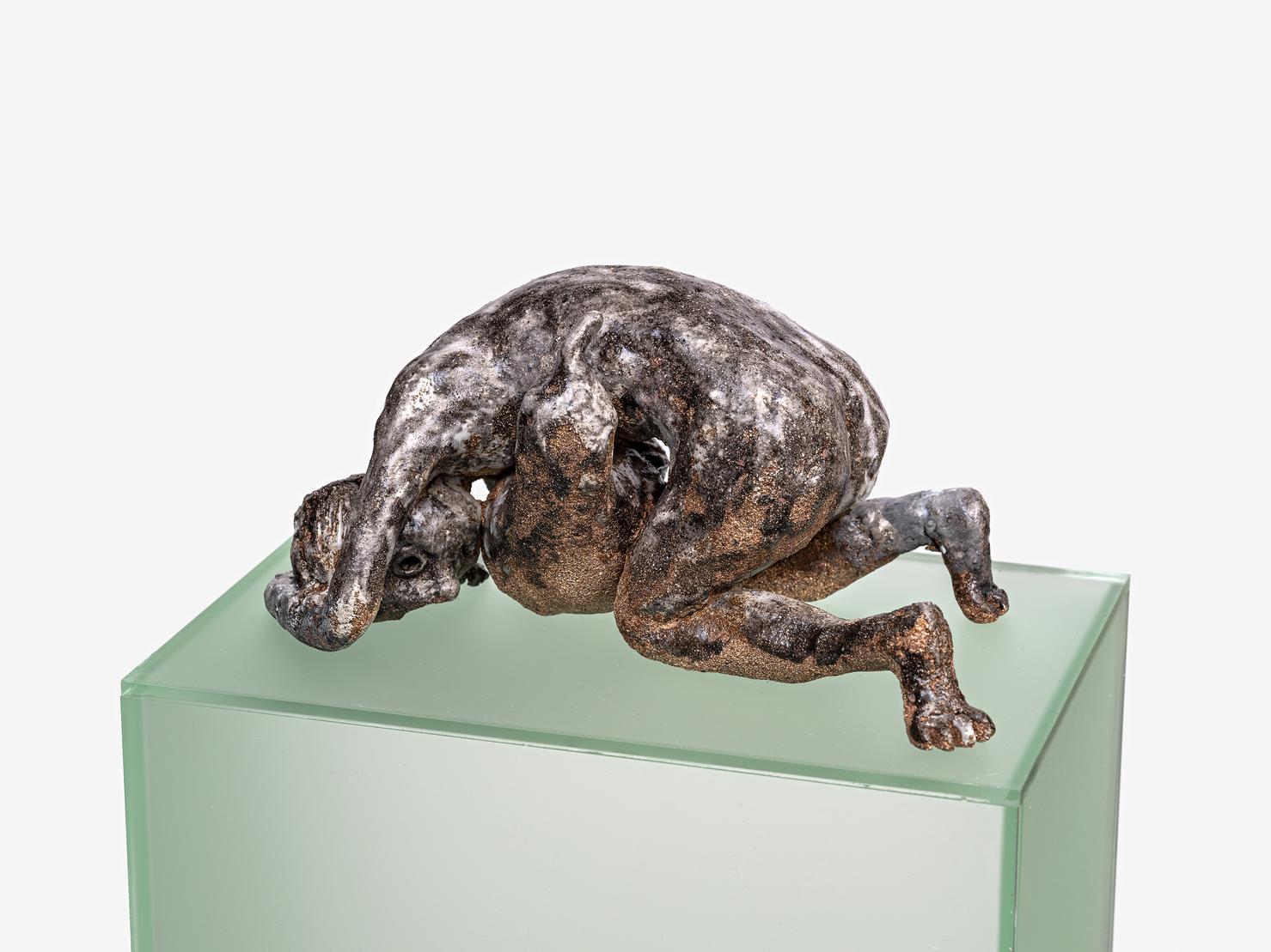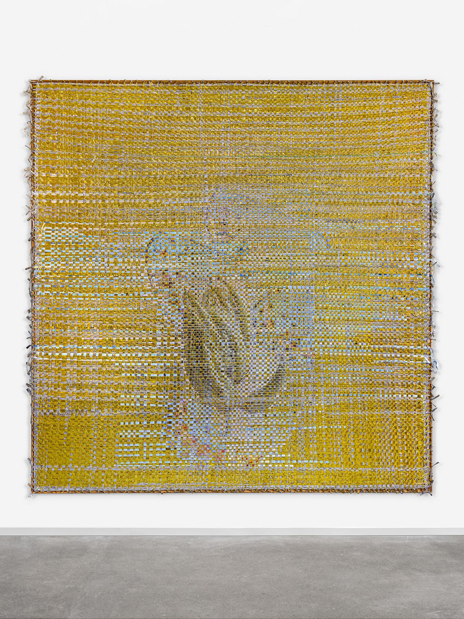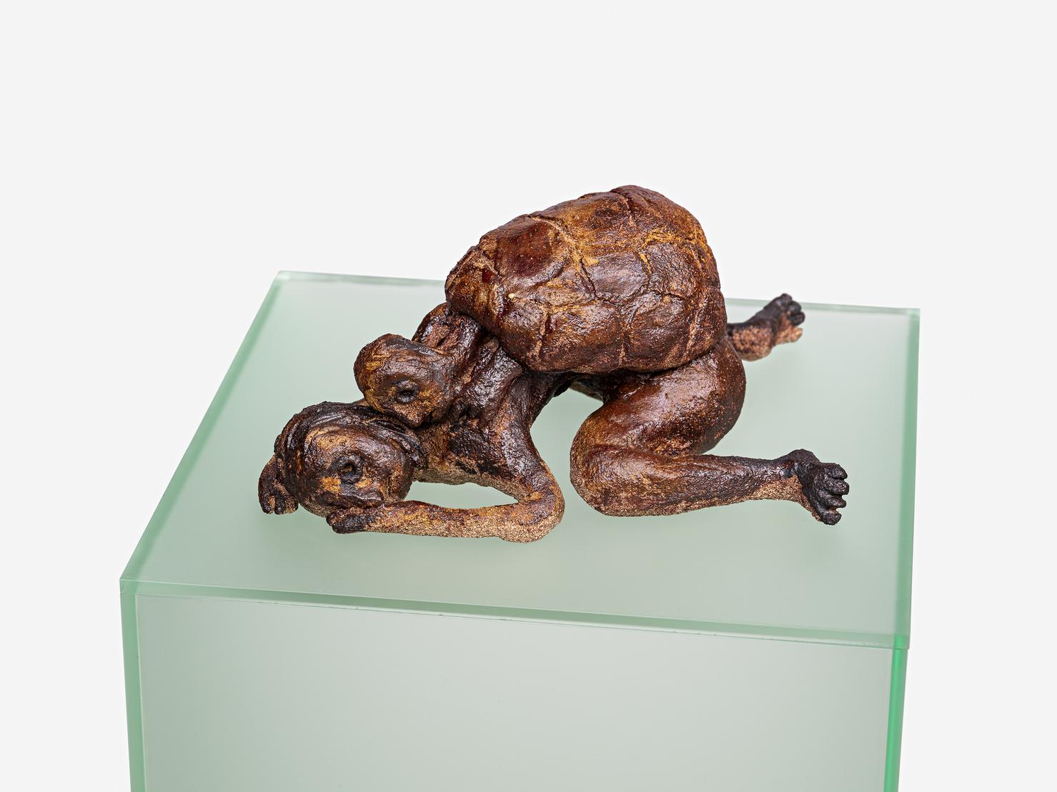 Femtensesse proudly presents a dual presentation of the Norwegian artists Eline McGeorge and Jennie Bringaker at Paris Internationale 2023. With a substantial sensibility for materials in weaving, watercolor and sculpture, both artists explore the complex relationships between humans and nature, in a time where human-caused damage to the earth is increasingly evident. Eline McGeorge weaves pictures of species on the brink of extinction into emergency blanket material. The imagery, based on video documentation from the artist’s first hand encounters with nature, turns into a shimmering, pixelated surface when entwined with the protective material. McGeorge’s own observations are also rendered as visual notes in watercolor. Bringaker’s tactile ceramic sculptures portray female figures in embrace that seemingly merge with outsized turtles and pears. Her surreal tableaus, presented on plexiglass pedestals, show humanity’s symbiotic relationship with flora and fauna, suggesting a rethinking of the human place in nature.