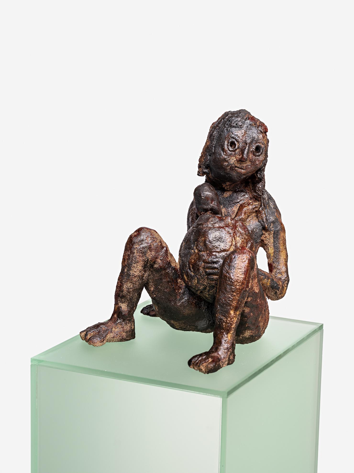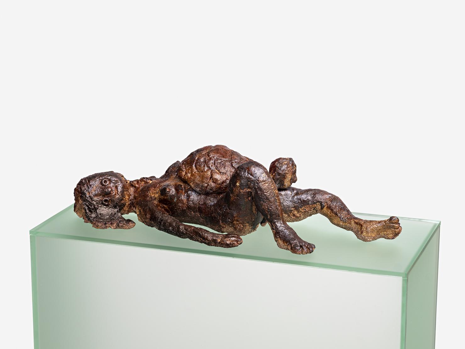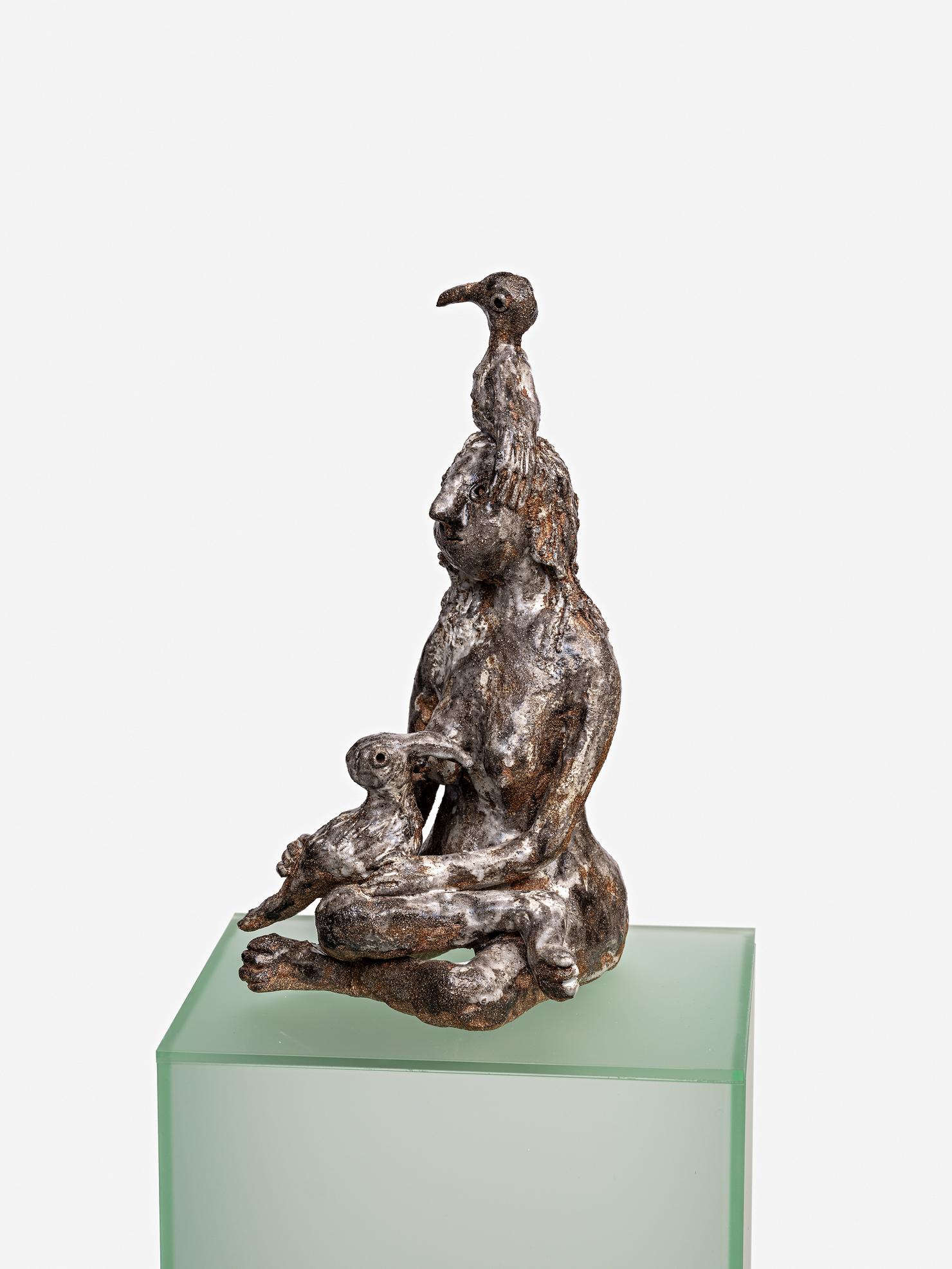 Femtensesse proudly presents a dual presentation of the Norwegian artists Eline McGeorge and Jennie Bringaker at Paris Internationale 2023. With a substantial sensibility for materials in weaving, watercolor and sculpture, both artists explore the complex relationships between humans and nature, in a time where human-caused damage to the earth is increasingly evident. Eline McGeorge weaves pictures of species on the brink of extinction into emergency blanket material. The imagery, based on video documentation from the artist’s first hand encounters with nature, turns into a shimmering, pixelated surface when entwined with the protective material. McGeorge’s own observations are also rendered as visual notes in watercolor. Bringaker’s tactile ceramic sculptures portray female figures in embrace that seemingly merge with outsized turtles and pears. Her surreal tableaus, presented on plexiglass pedestals, show humanity’s symbiotic relationship with flora and fauna, suggesting a rethinking of the human place in nature.