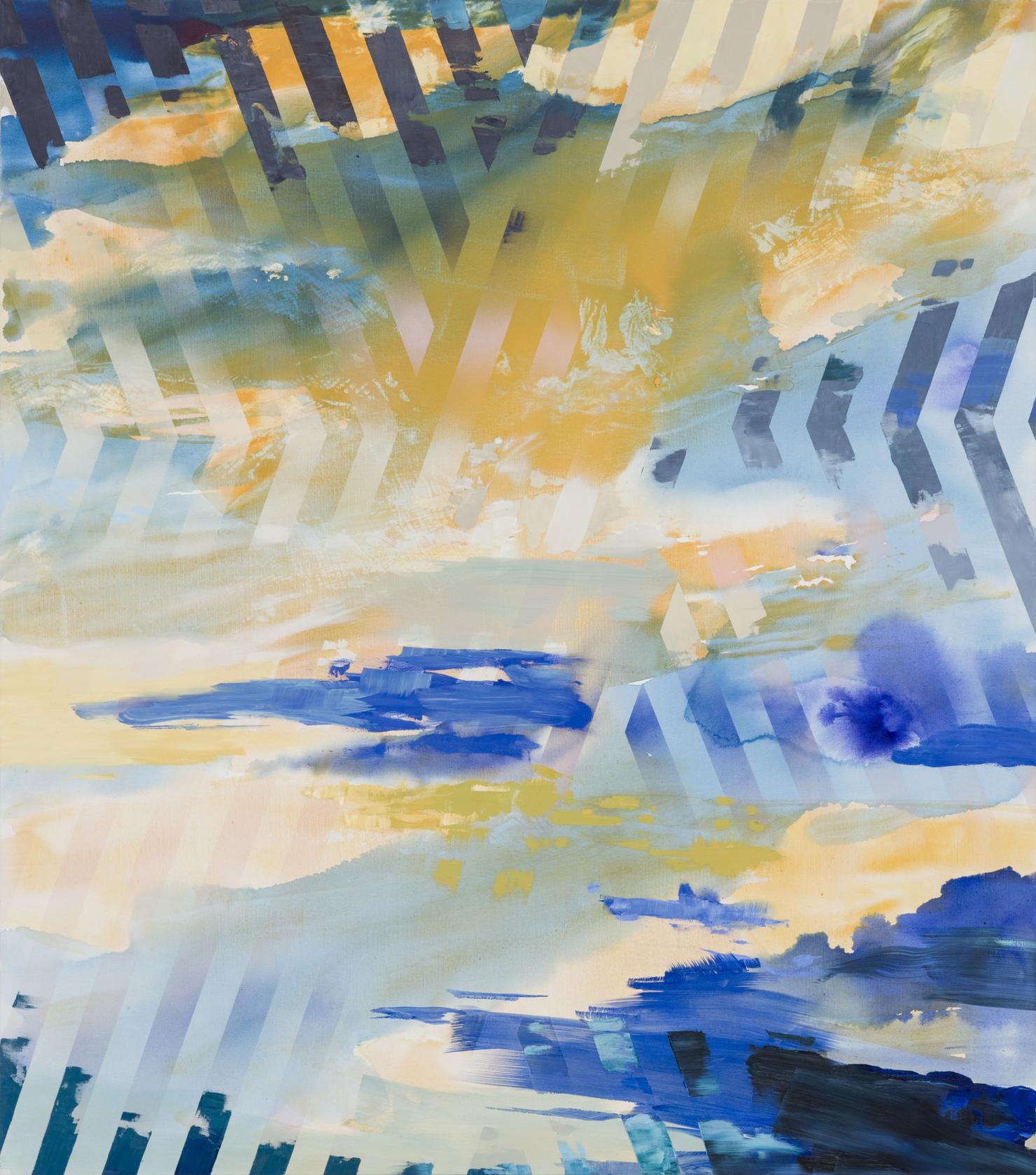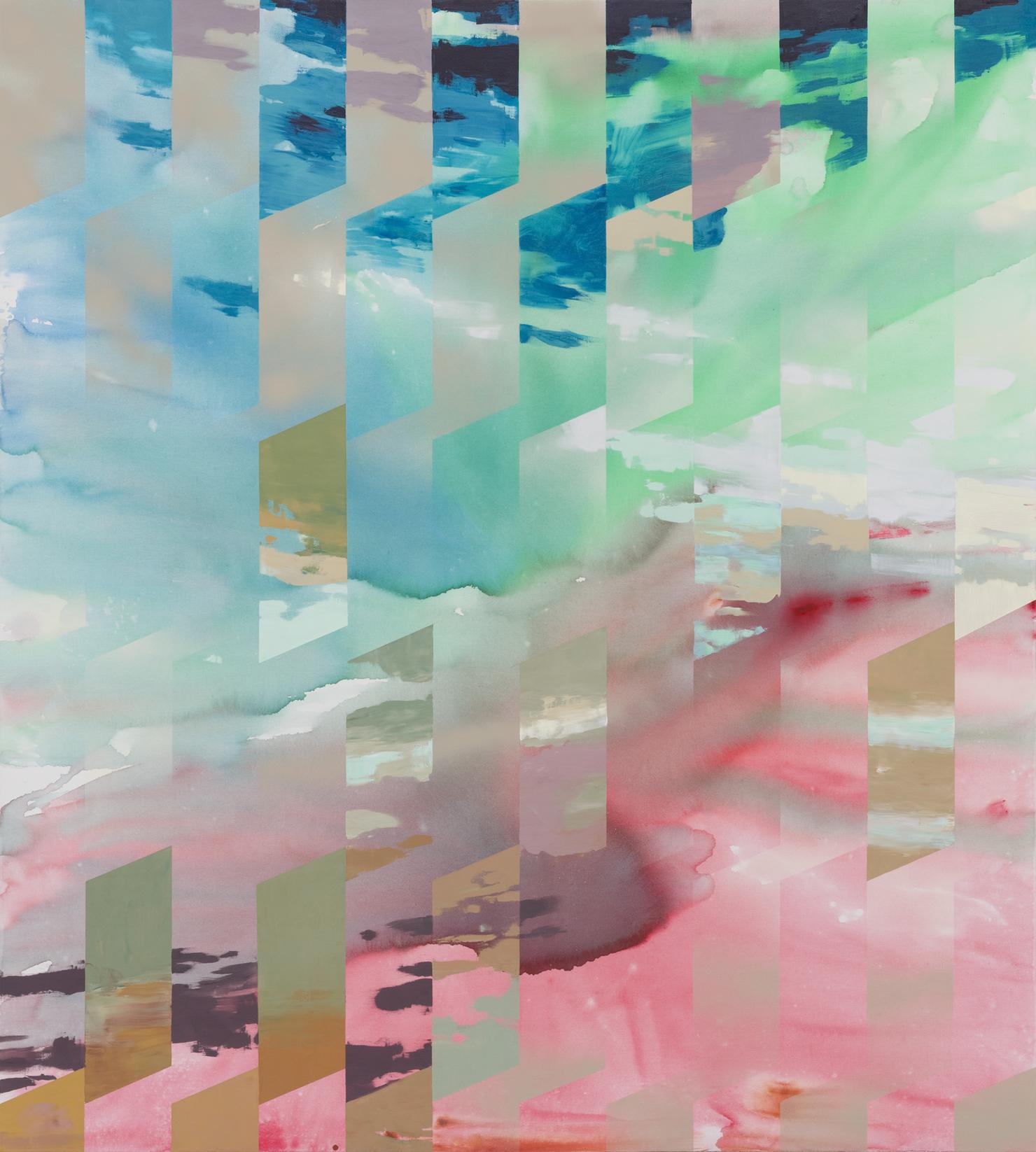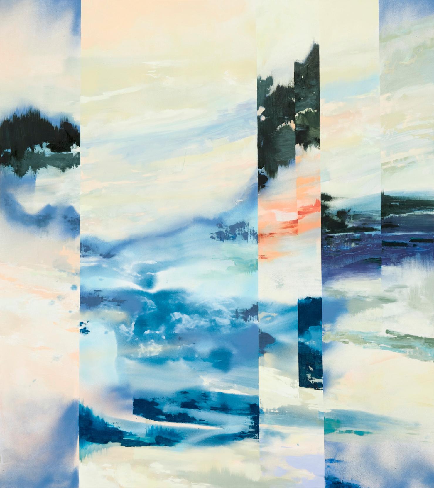 Informing her work is a sensorial idea of fragmented space — simultaneously synchronic and deferred — with the landscape as a catalyst where the limitations of two-dimensionality are explored through the introduction of geometric lines and fixed frames that disrupt the picture plane. This idea creates an optical illusion that seemingly encompasses multiple dimensions within one flat surface.