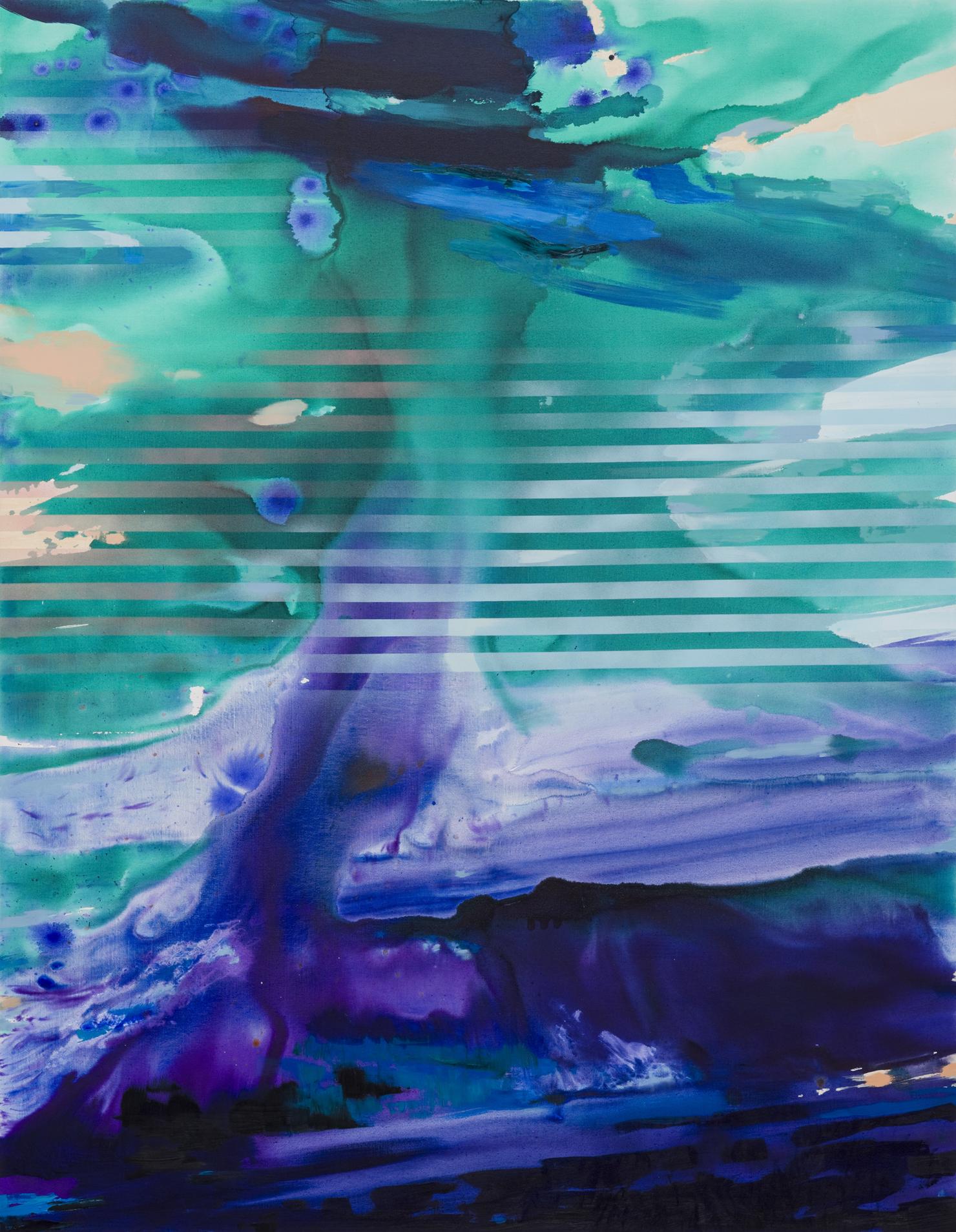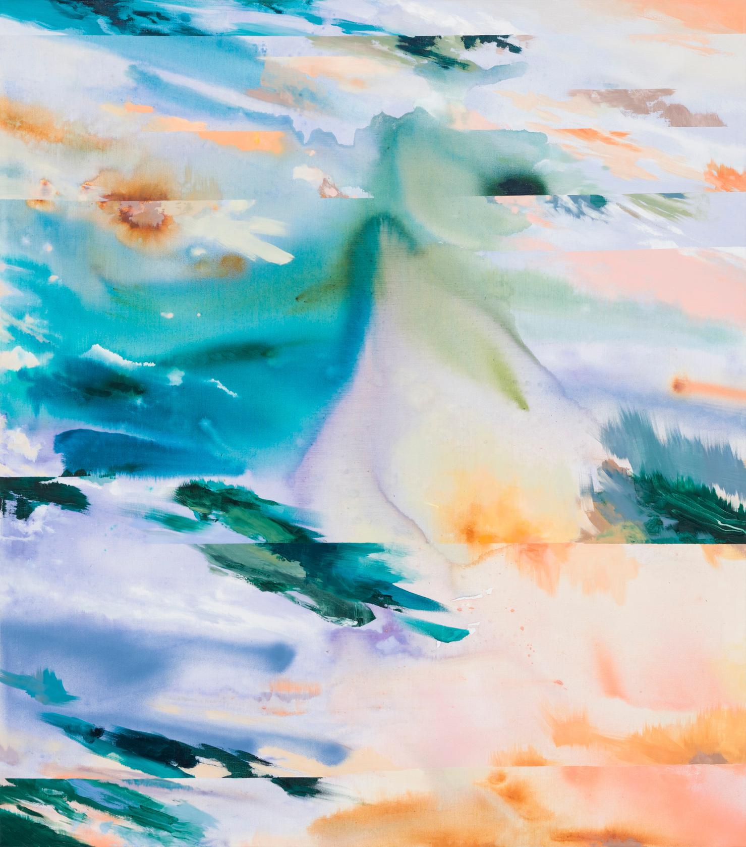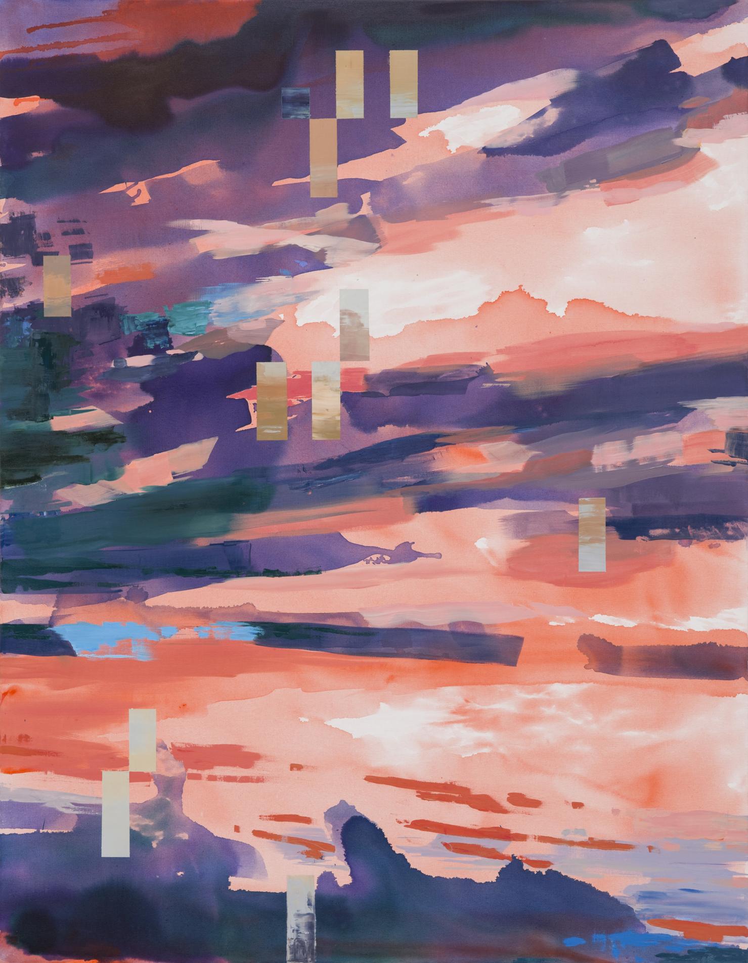 Informing her work is a sensorial idea of fragmented space — simultaneously synchronic and deferred — with the landscape as a catalyst where the limitations of two-dimensionality are explored through the introduction of geometric lines and fixed frames that disrupt the picture plane. This idea creates an optical illusion that seemingly encompasses multiple dimensions within one flat surface.