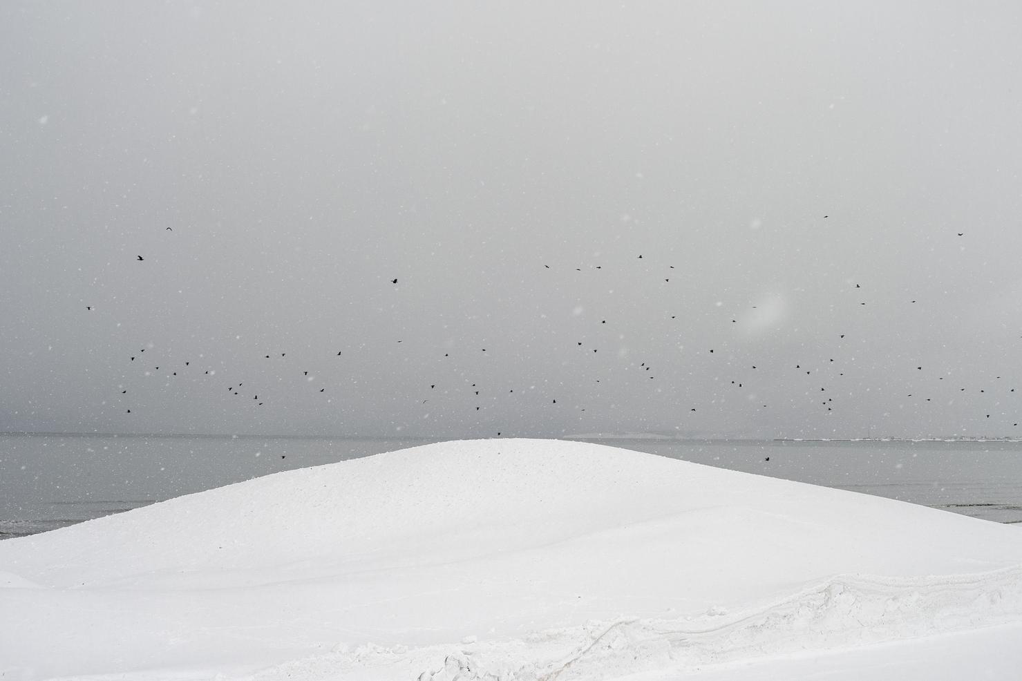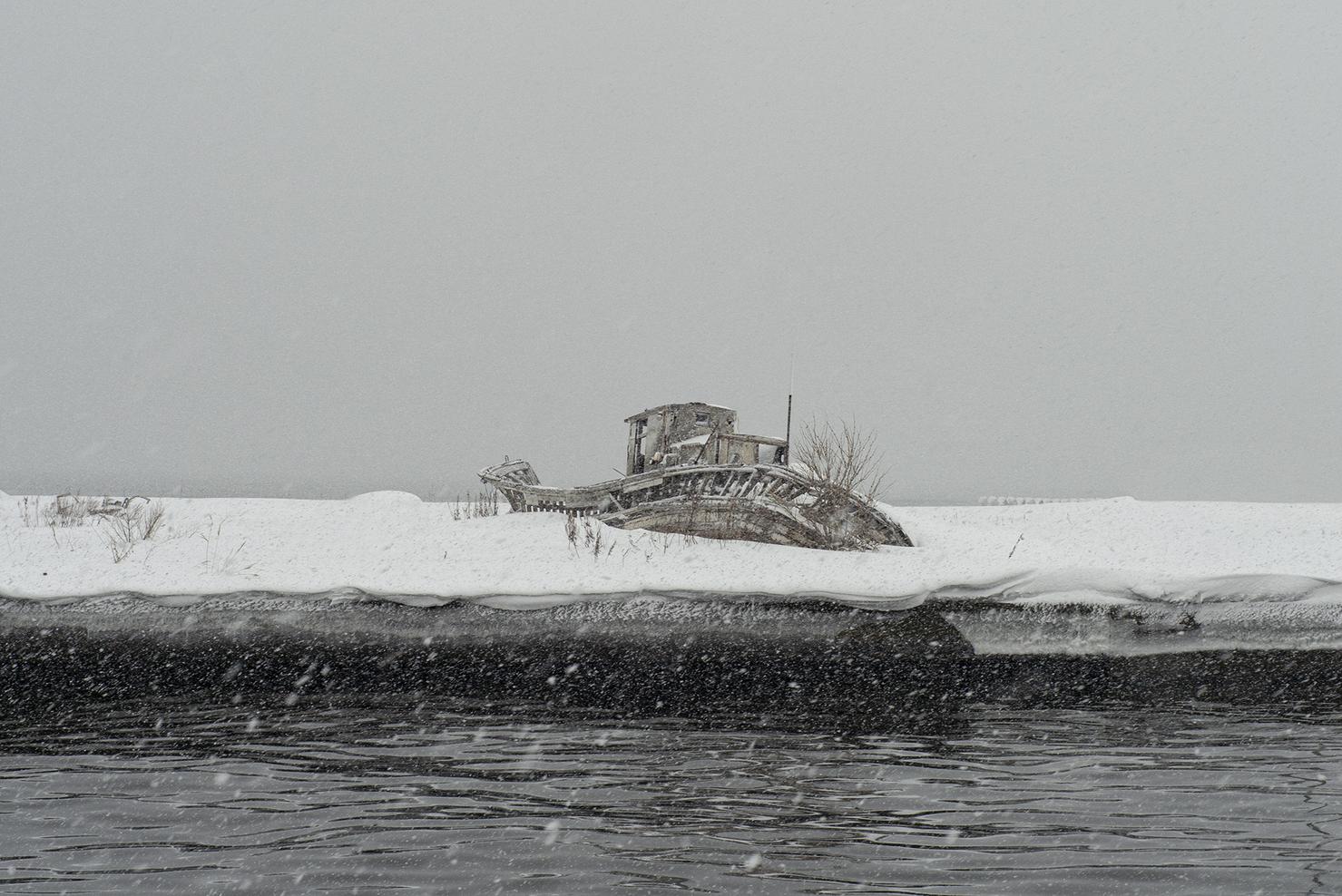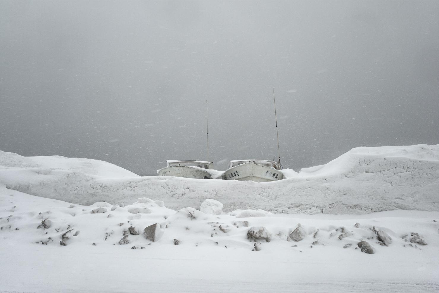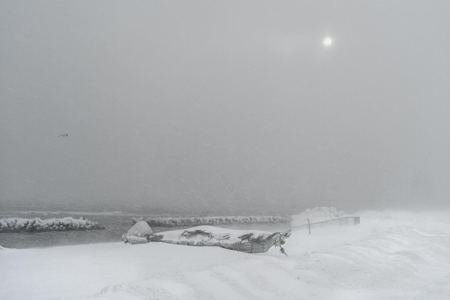 There is little or no sign of life or movement, except for the flight of a few crows, whose black silhouettes appear like graphic punctuation marks in her viewfinder. The place is deserted by fishermen, the fish factories closed: a few boats, frozen in the landscape and largely covered with snow, emerge from the mist like ghosts. The clouds, the low sky, the snowflakes carried by the wind that sometimes form a screen, and a grey sea in the distance fill the frame of the image. Some plants, a few stalks of reeds or dried sunflower flowers, resist and emerge from the snow dunes; they draw timid strokes of colour contrasting with a palette of tones that unfolds mainly between white and grey. Sometimes, during the day, there is a break in the clouds, the sun tries to pierce the cloud cover and the atmosphere is transformed.