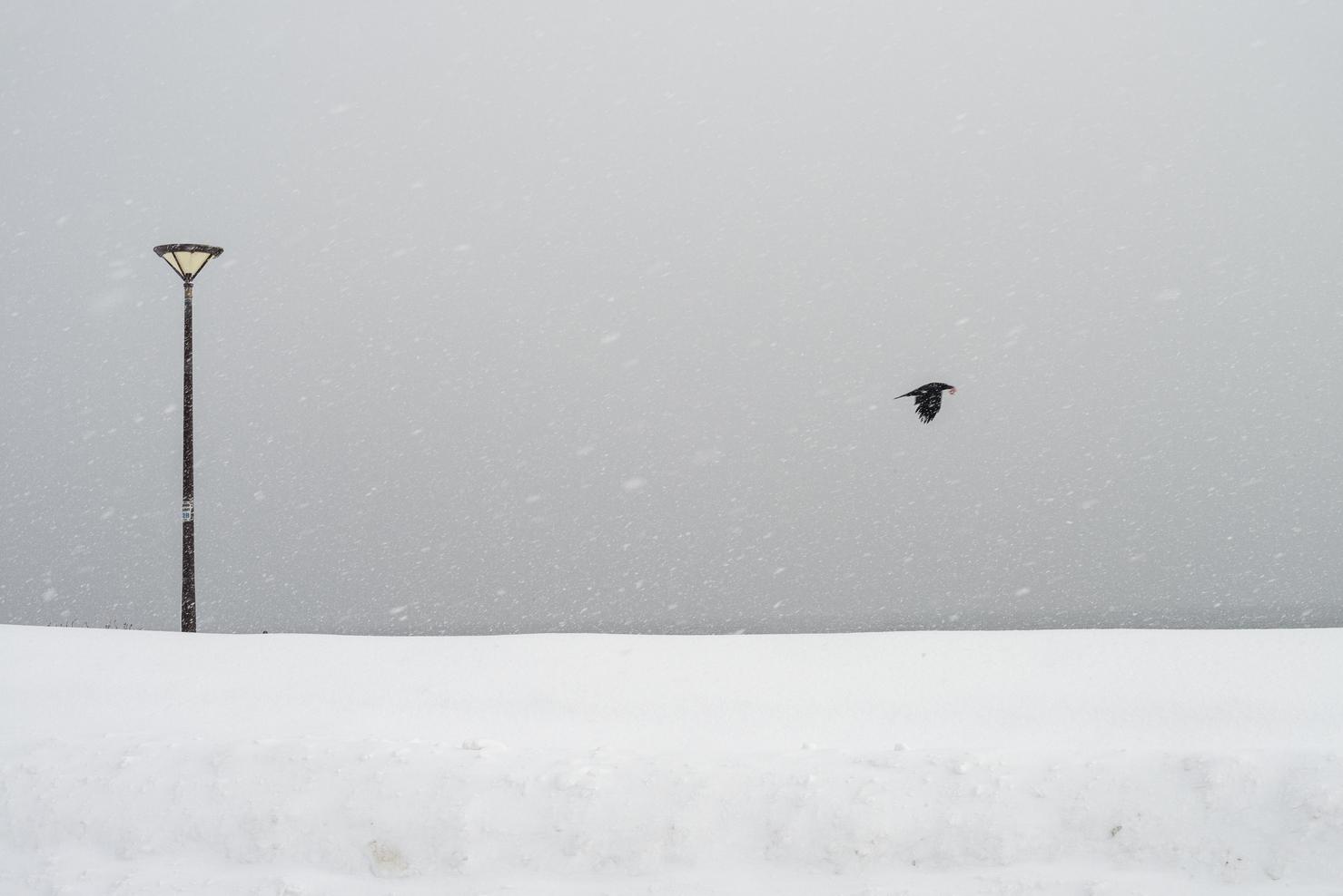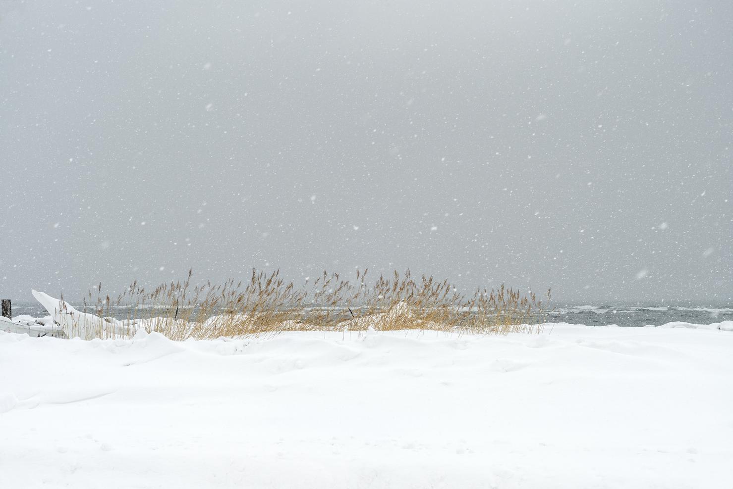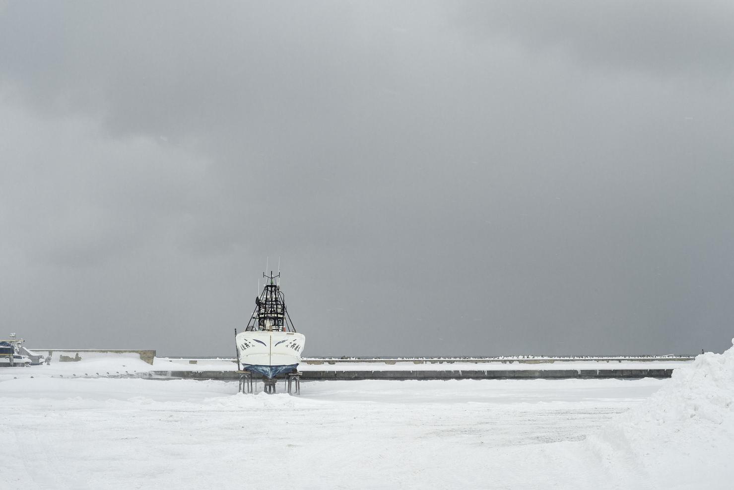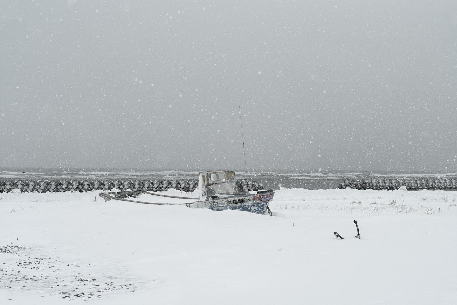 There is little or no sign of life or movement, except for the flight of a few crows, whose black silhouettes appear like graphic punctuation marks in her viewfinder. The place is deserted by fishermen, the fish factories closed: a few boats, frozen in the landscape and largely covered with snow, emerge from the mist like ghosts. The clouds, the low sky, the snowflakes carried by the wind that sometimes form a screen, and a grey sea in the distance fill the frame of the image. Some plants, a few stalks of reeds or dried sunflower flowers, resist and emerge from the snow dunes; they draw timid strokes of colour contrasting with a palette of tones that unfolds mainly between white and grey. Sometimes, during the day, there is a break in the clouds, the sun tries to pierce the cloud cover and the atmosphere is transformed.