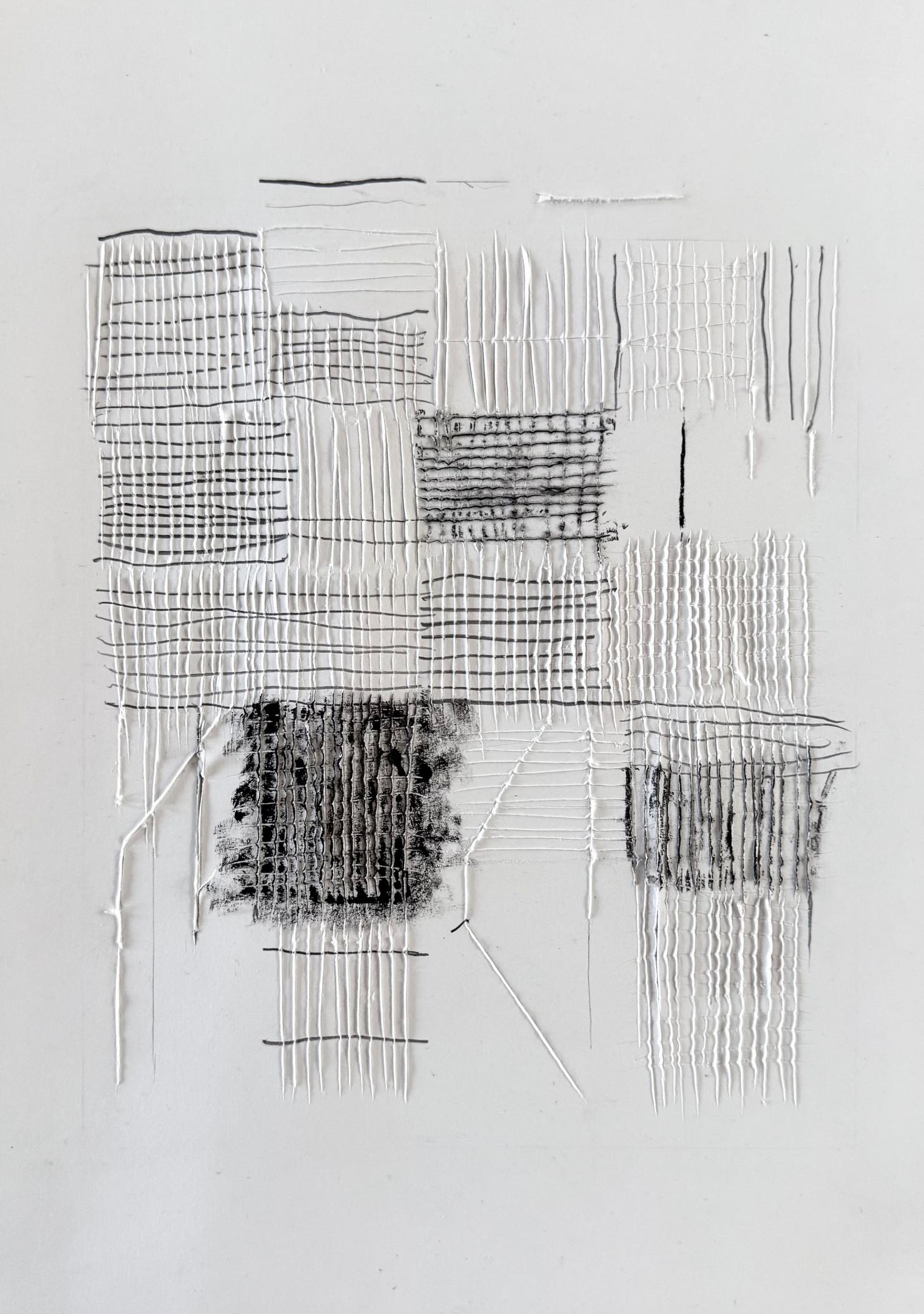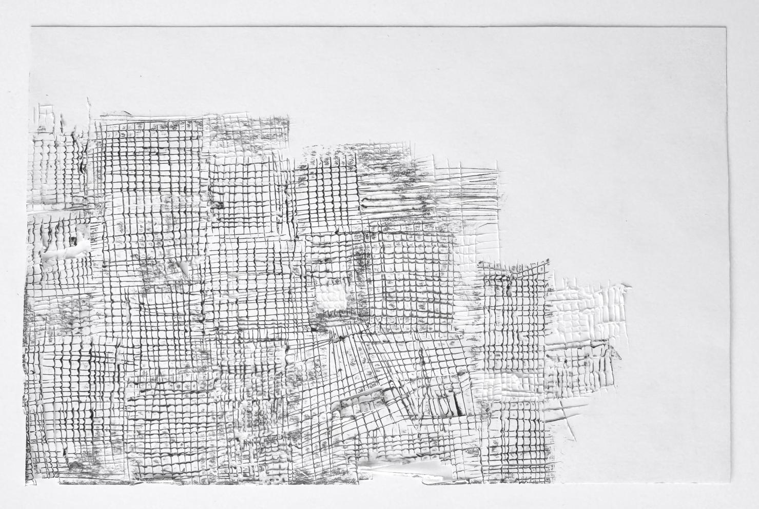 Leonie Mertes erprobt mit ihren Papierarbeiten neue Formen der Zeichnung, greift dabei auf klassische Materialen zurück – ein naturweißes 190g Zeichenpapier und Graphitstifte der Stärken HB bis 2H. Diese einfachen Mittel dienen ihr, um das Verhältnis zwischen Graphitzeichnung und ihrem Bildträger zu hinterfragen. So nutzt sie den Graphitstift etwa um durch kurze, dicht aneinander gesetzte, kurze Striche Fasern aus dem Blatt zu lösen, so dass sie regelrecht abstehen. Dabei entsteht eine filzhafte Oberfläche, die im spannenden Kontrast zur glatten Oberfläche des Papiers steht.