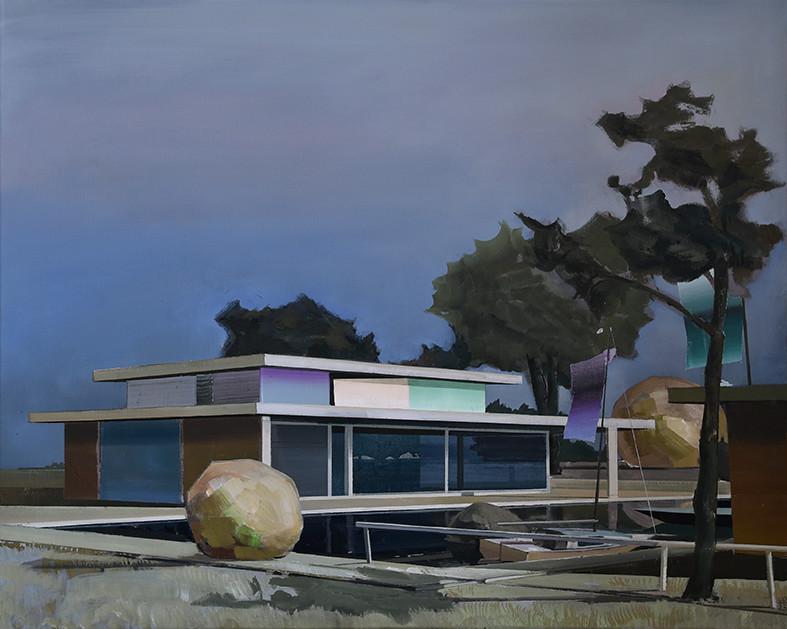 Some works intensify this narrative through additional space-defining elements like golden spheres or gold-colored rock formations, serving as connectors between landscape and architecture. These forms, historically representing the sun or cosmic elements such as meteorites in the realm of painting, introduce further existential dimensions to the images. They simultaneously underscore the significance of form and color for Ulf Puder. In these new works, the artist continues to navigate the threshold between representational and abstract art, constructing representative images from organic and geometric, abstract forms. Combined with an atmospherically rich color palette punctuated by luminous details, architectural landscapes unfold before our eyes—familiar yet seemingly beyond space and time.