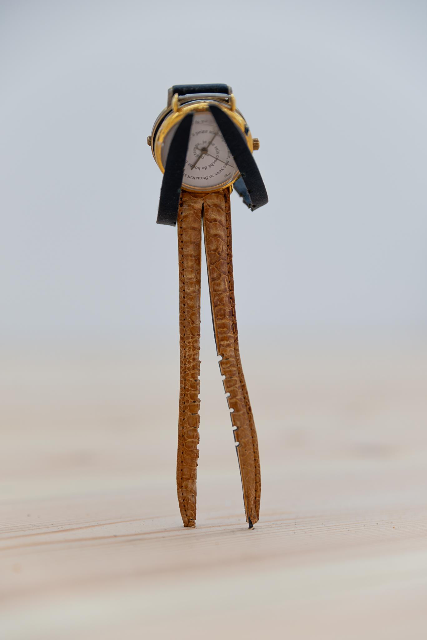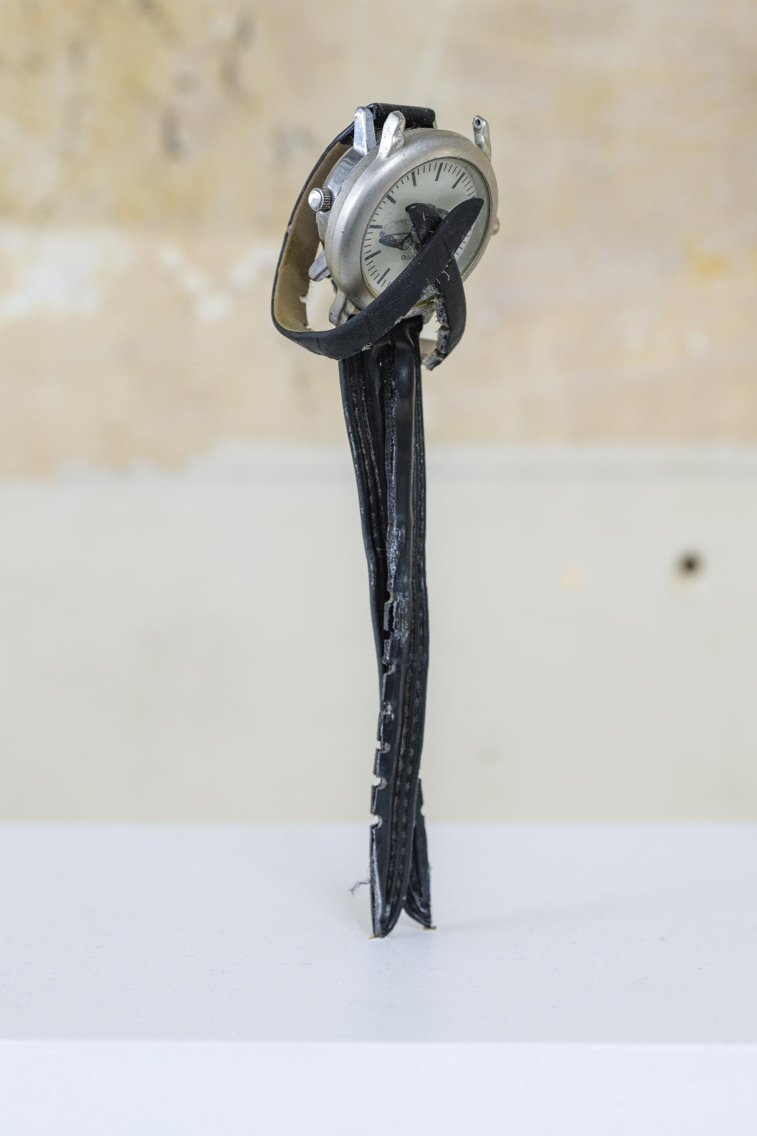 Complementing the photographic works are sculptural pieces made from watches and shoes, transformed into configurations that hover between the personal and the universal. Wristwatches, sourced from Paris flea markets during Ruud’s residency at Cité Internationale des Arts, are assembled into bodily forms, suggesting figures intertwined in symbiotic embrace or caught in monogamous echo chambers. This act of fusion continues in Ruud’s sculptures made from men’s leather dress shoes, pressed together to form wheels, suggesting power spinning endlessly, trapped in its own motion.