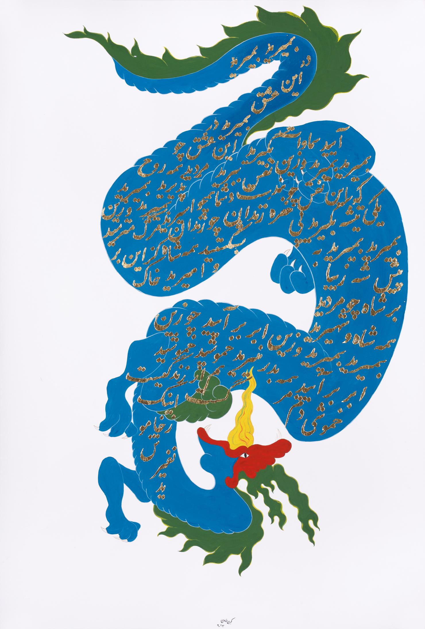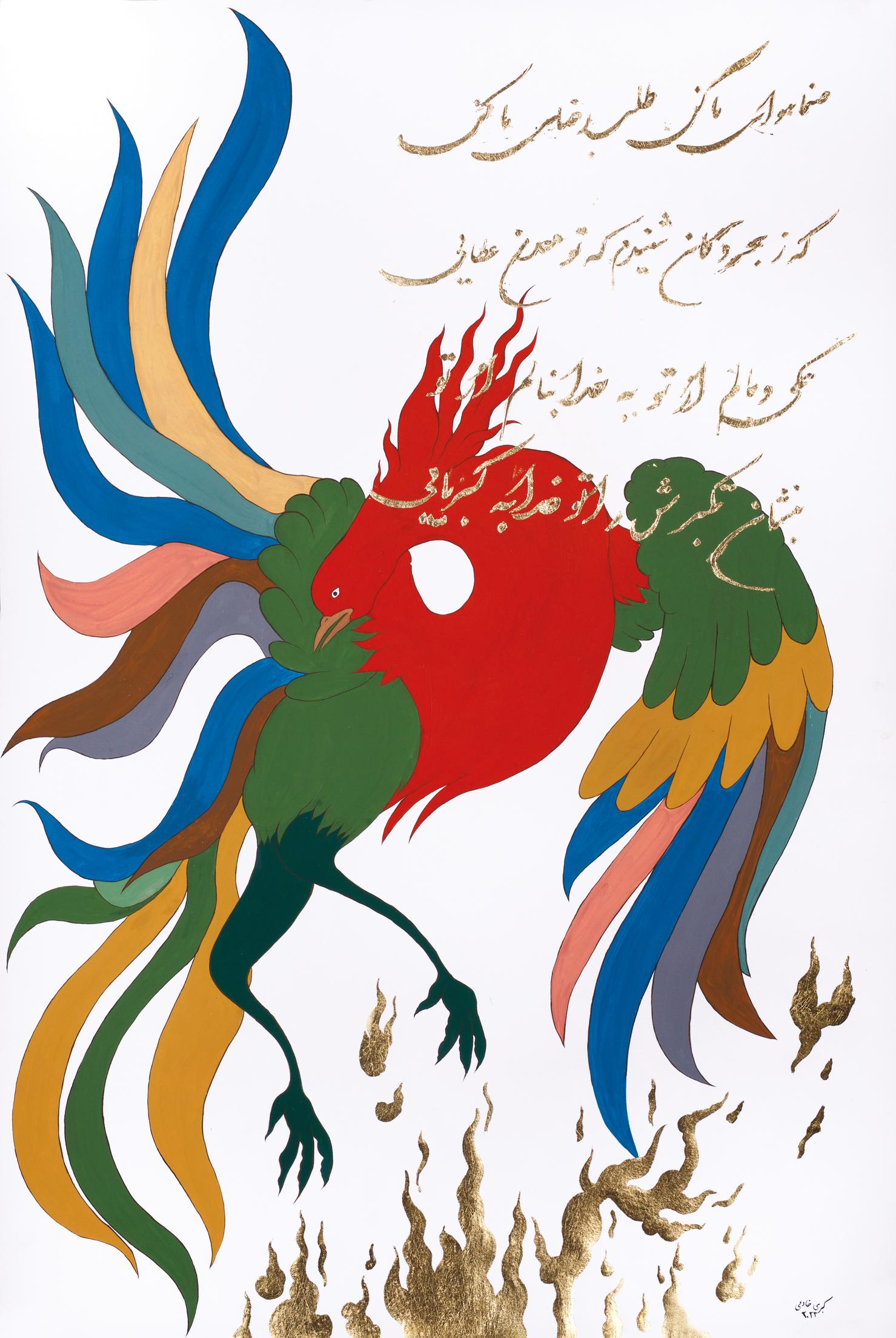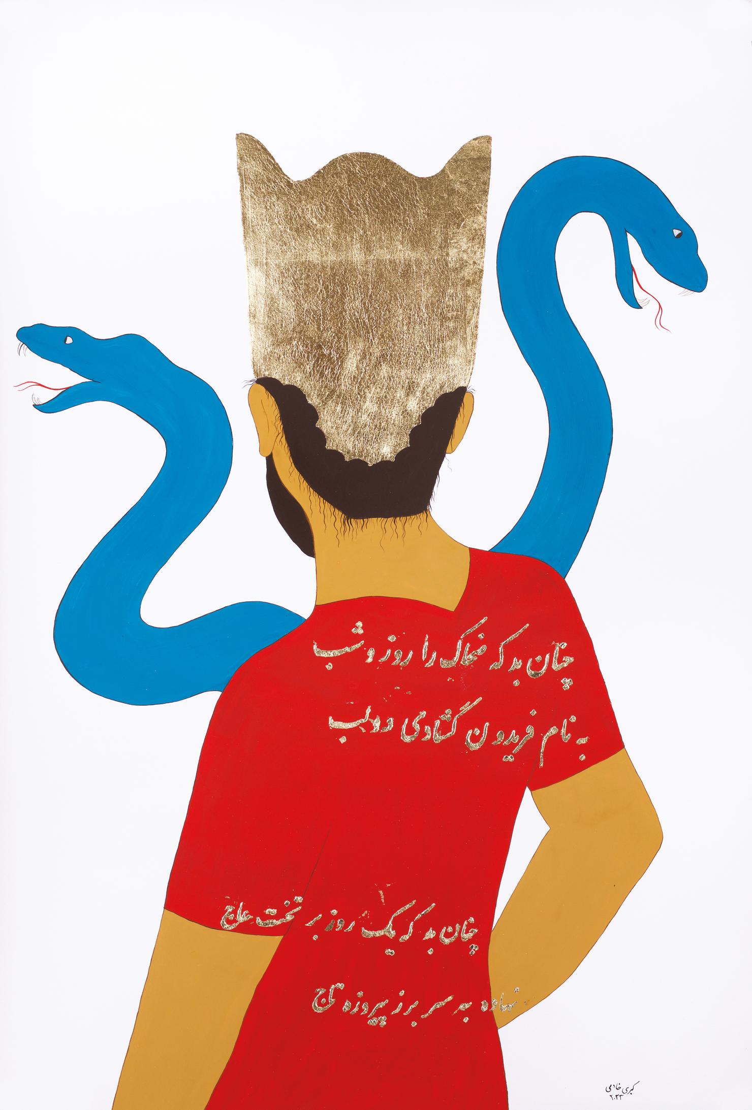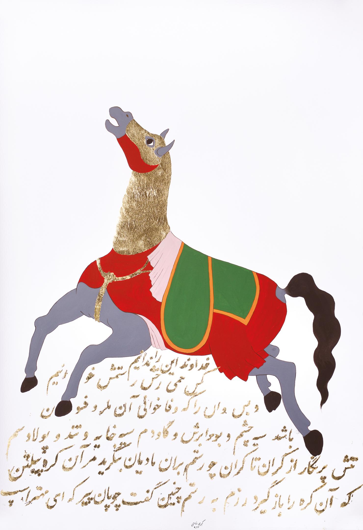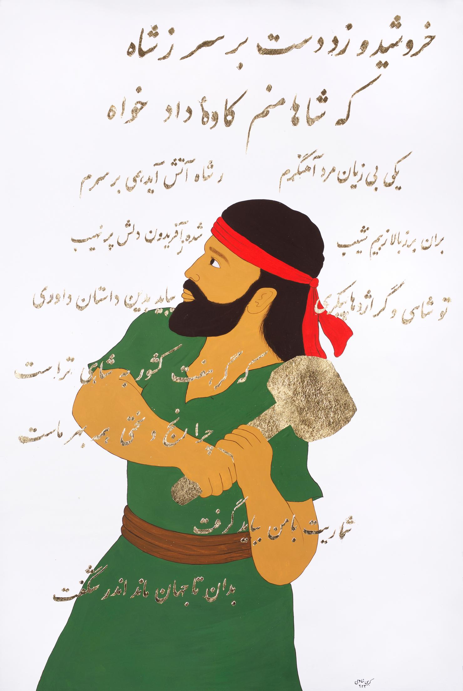 While Ali mixes in his paintings realistic images of contemporary exile with skillfully traditionally painted settings, Khademi’s works that we are featuring use metaphoric images to illustrate her daily fight against patriarchy, ignorance and violence. The artist offers us a colorful pantheon of the human weaknesses and virtues in the guise of epic kings and mythical animals, as they were previously described by Ferdowsi in the 10th century in his Shahnâma. Rooted in ancestral traditions these images remain today very contemporary and obvious to every member of the Persian culture community.
